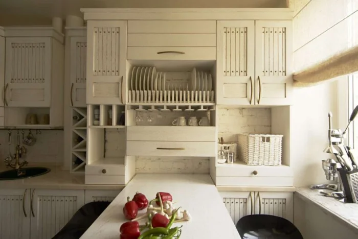 - Мебель до потолка. Верхние шкафы должны быть под самый потолок. Это даст дополнительный объём для хранения и уберёт пылевую полку.