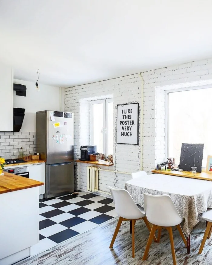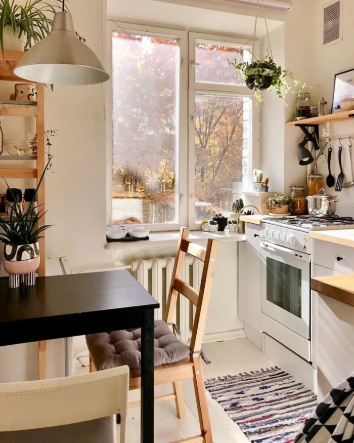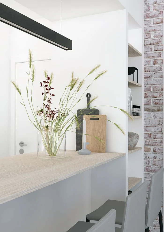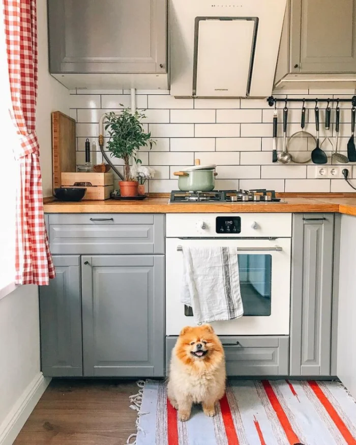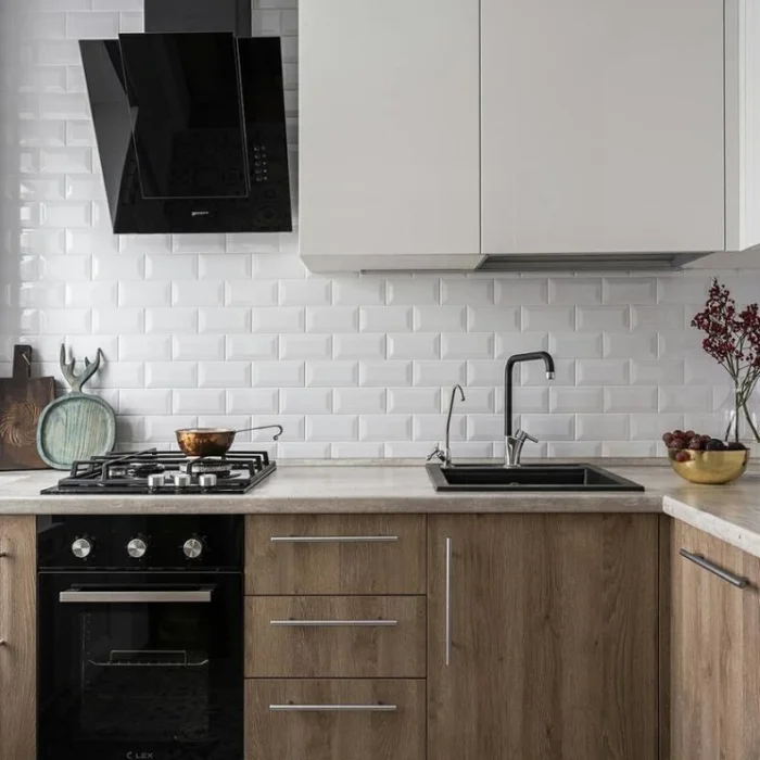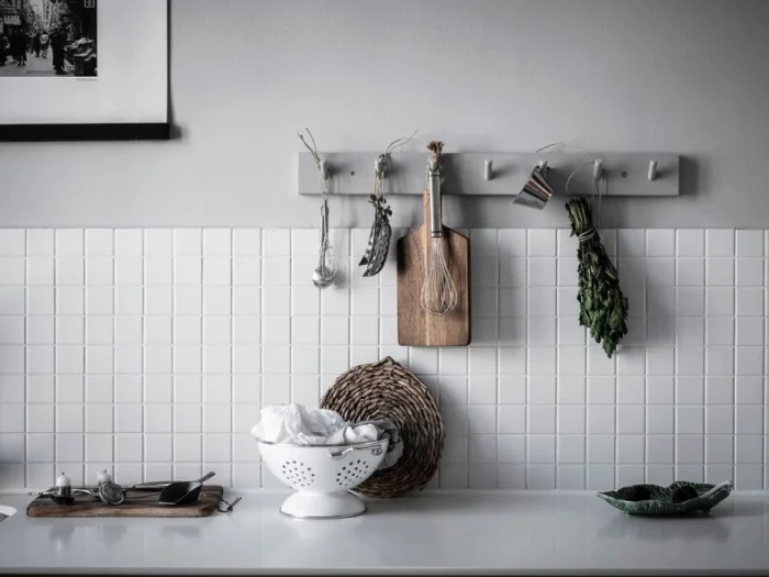 Скандинавский стиль — тот же светлый фон, но допускает больше уюта: деревянные акценты, неброский текстиль в клетку, керамика. Можно добавить пару ярких деталей — жёлтый чайник или зелёное растение.
