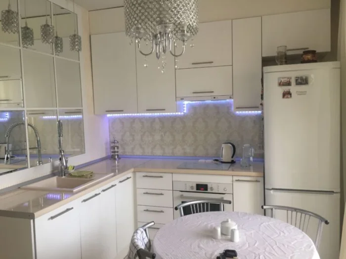 - Свет. Не одна люстра, а несколько точечных светильников по периметру + подсветка рабочей зоны.