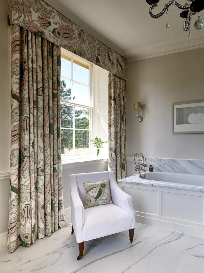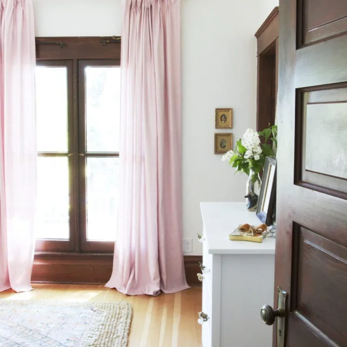 Хотите визуально приподнять потолок? Секрет прост: длинные, строго вертикальные шторы от самого карниза до пола, без зазоров. А если выбрать ткань, которая мягко ложится в напольные складки, комната ещё и «раздвинется» в ширину. Двойной эффект!