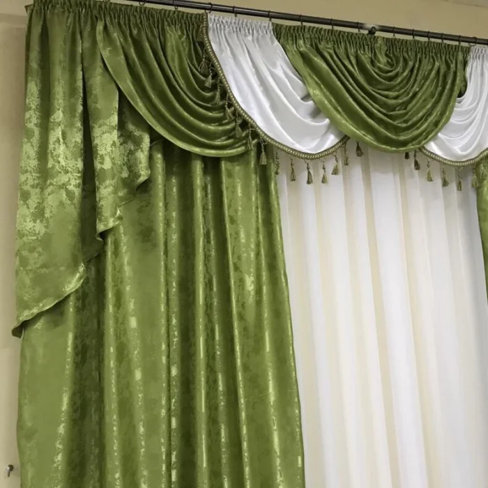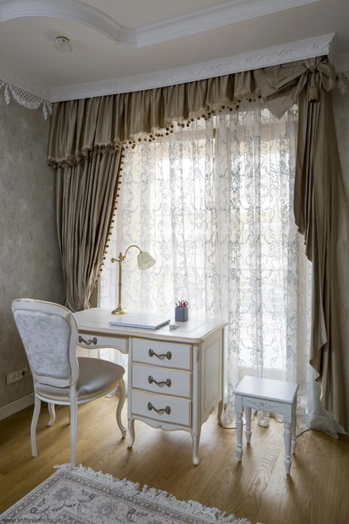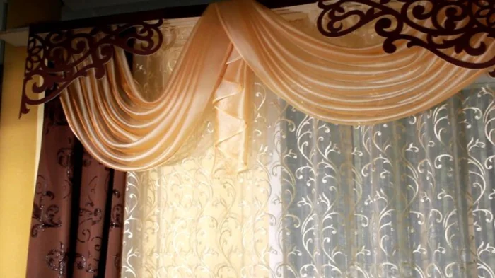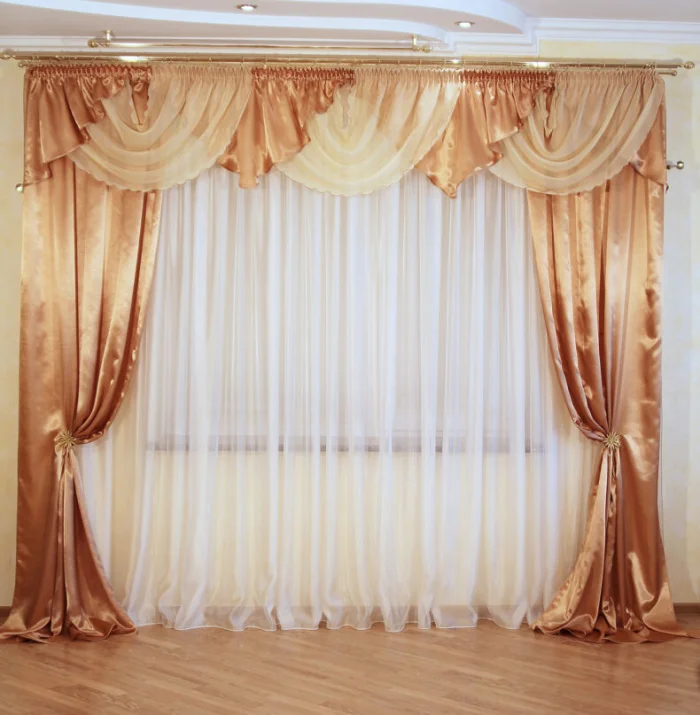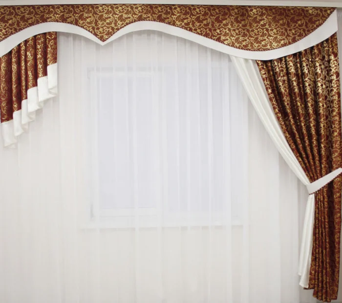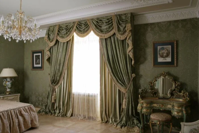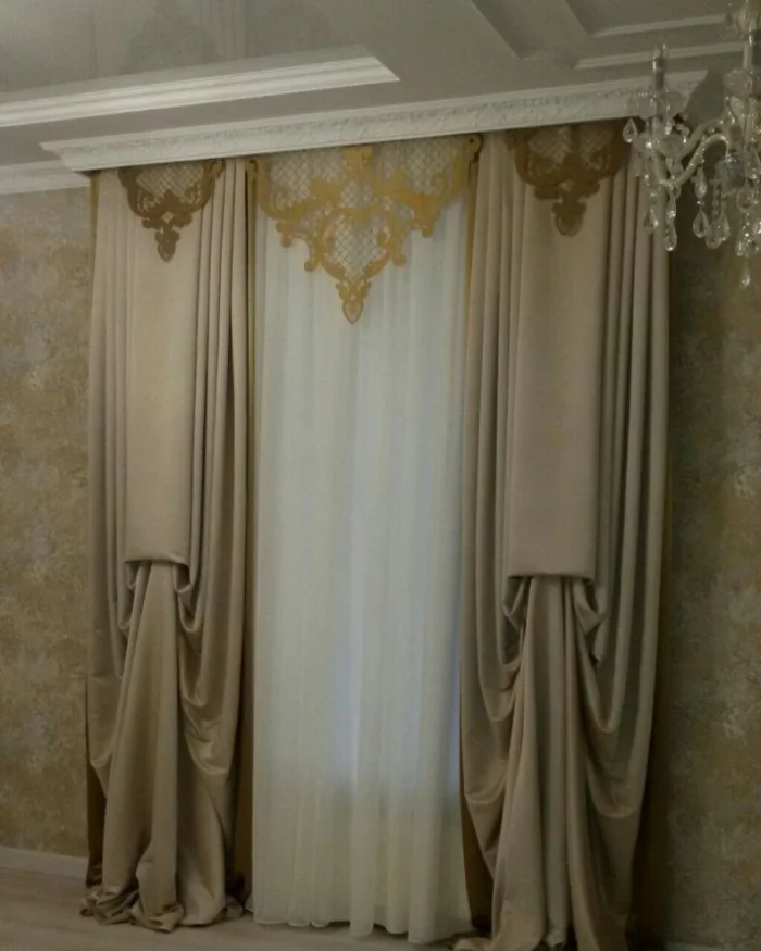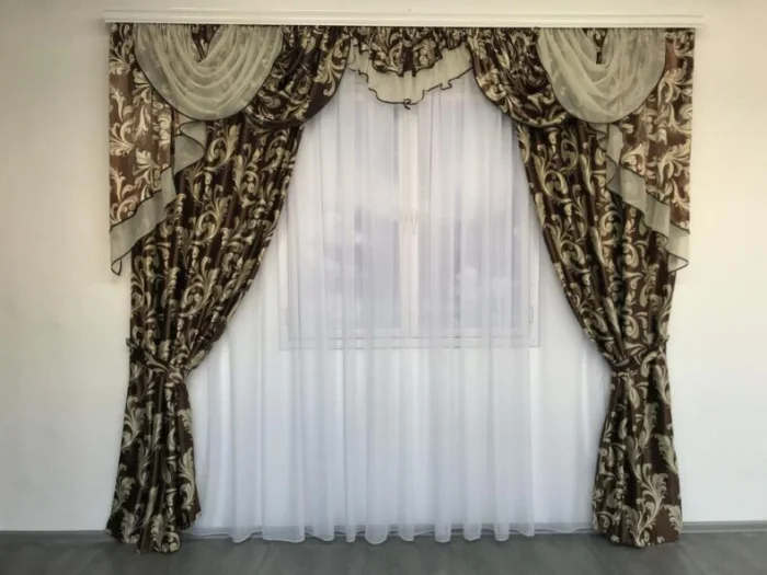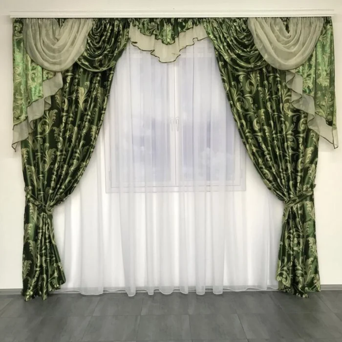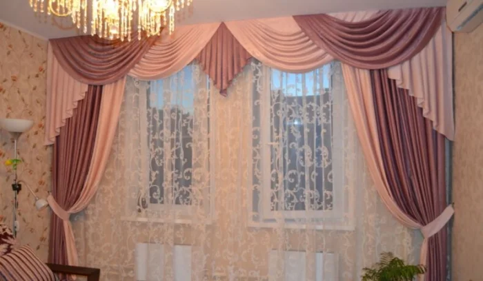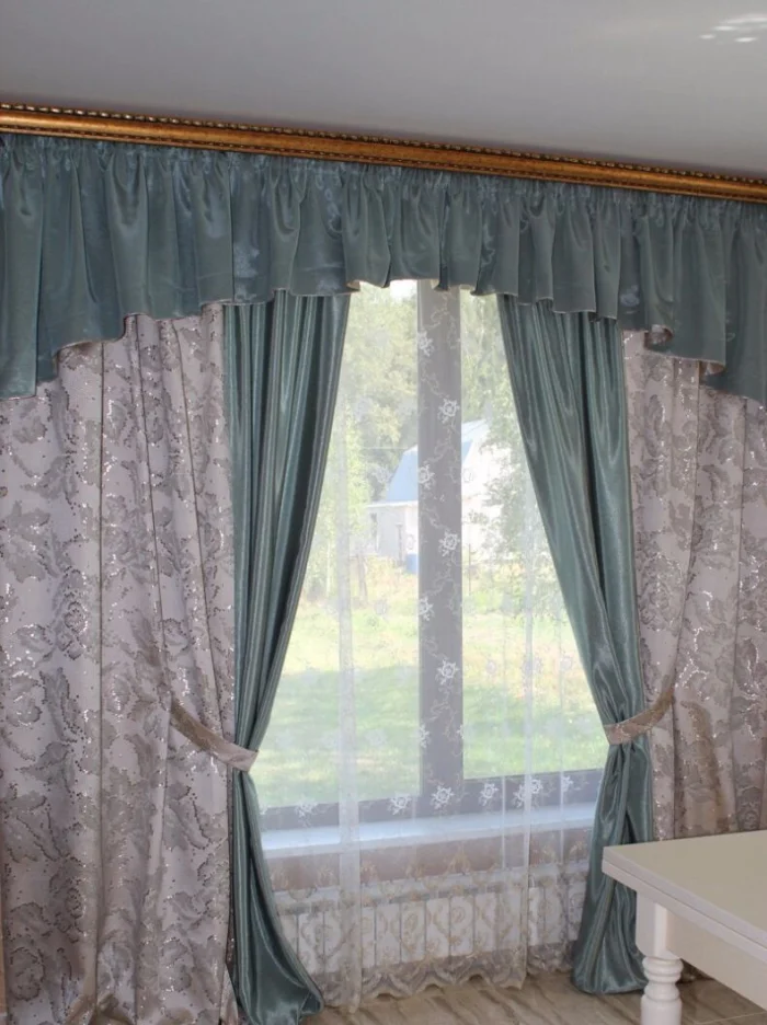 Кстати, ламбрекен и портьеры не обязаны быть из одного материала! Если шторы сшиты из тяжёлого жаккарда, то мягкие сваги можно сделать из струящегося атласа в тон, украсив лёгкими складками.