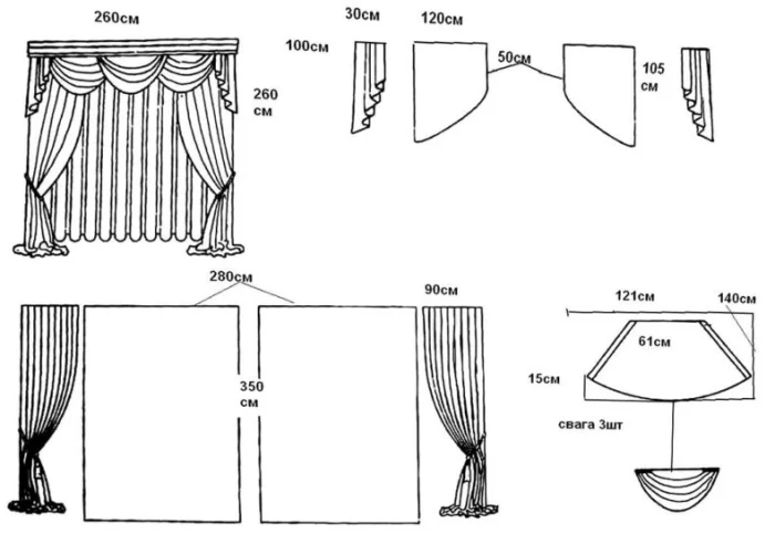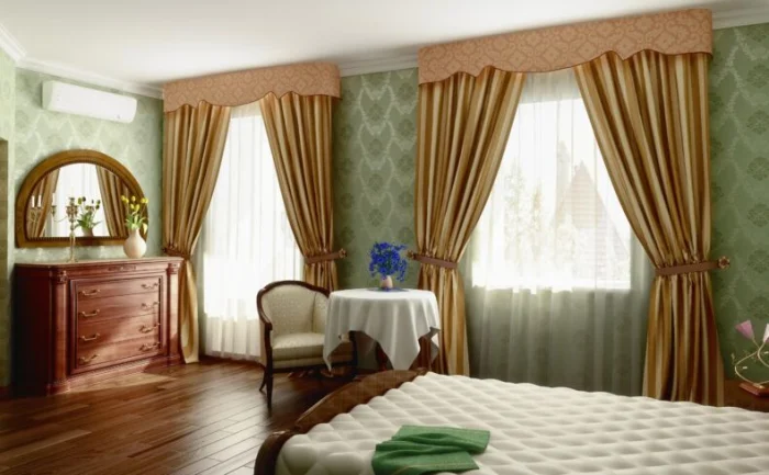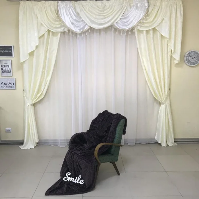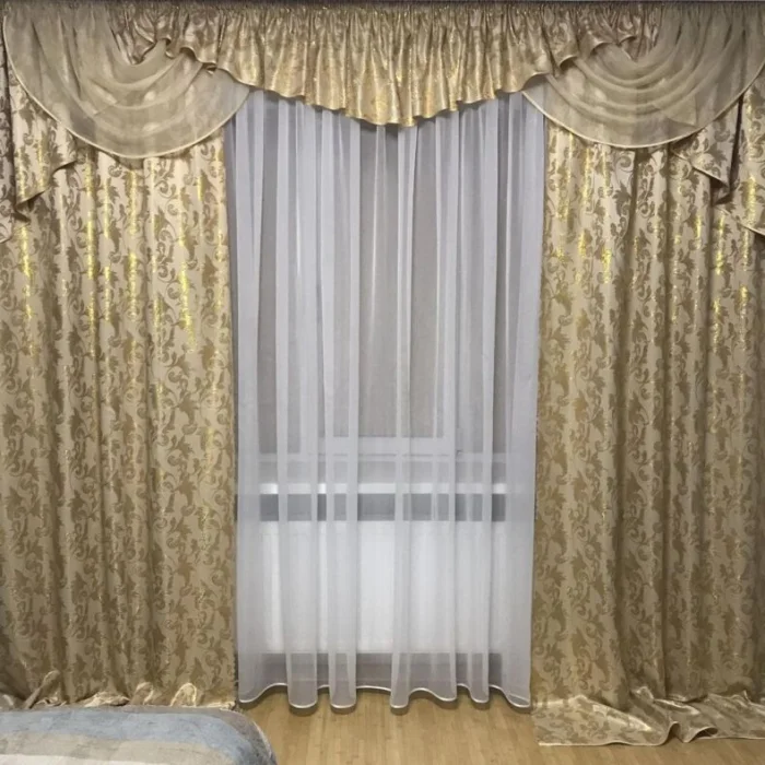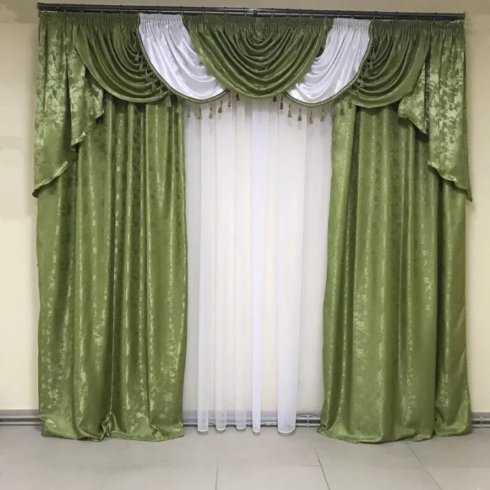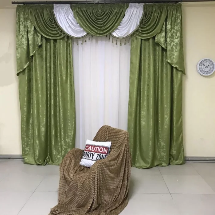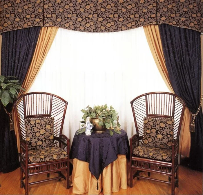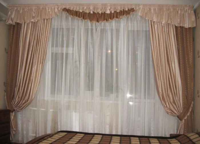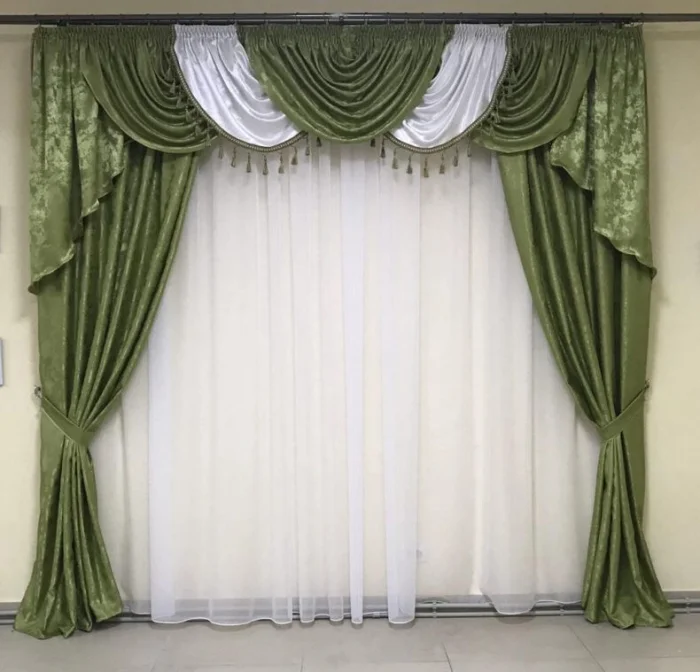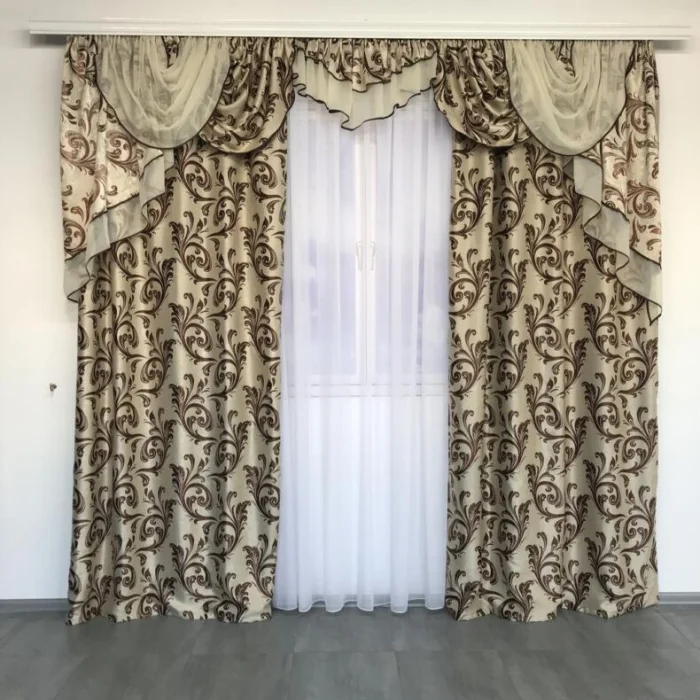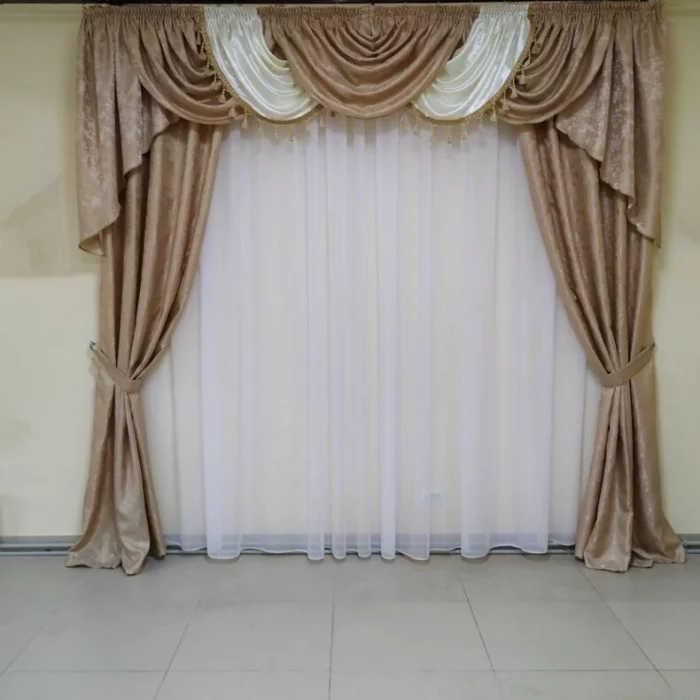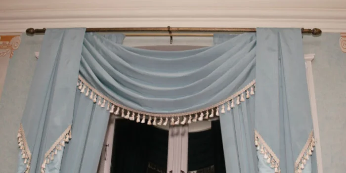 Кстати, ламбрекен и портьеры не обязаны быть из одного материала! Если шторы сшиты из тяжёлого жаккарда, то мягкие сваги можно сделать из струящегося атласа в тон, украсив лёгкими складками.