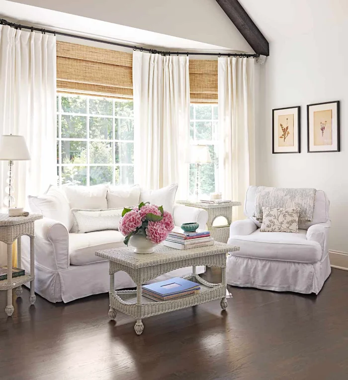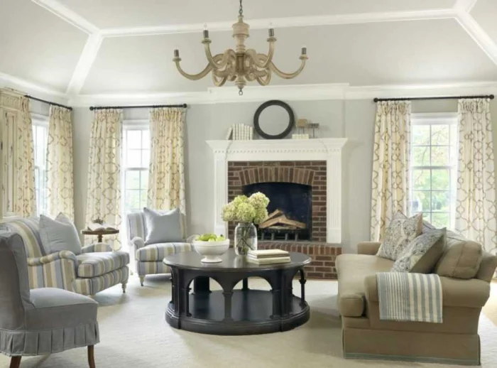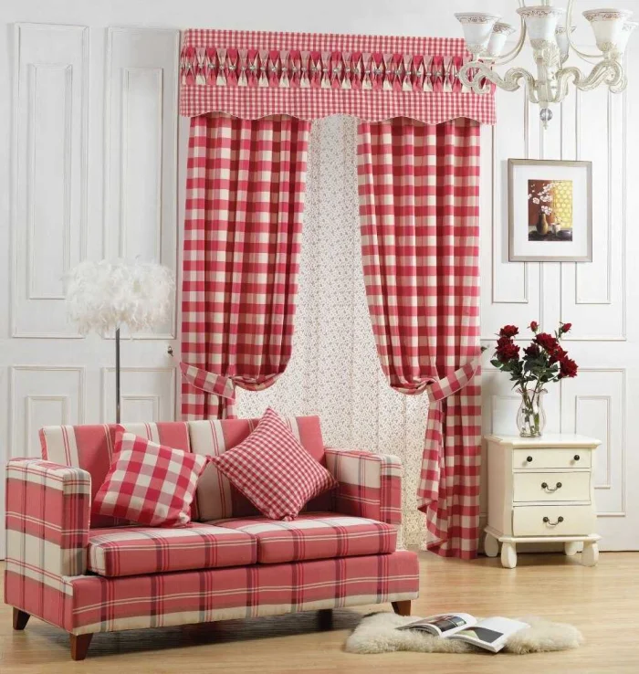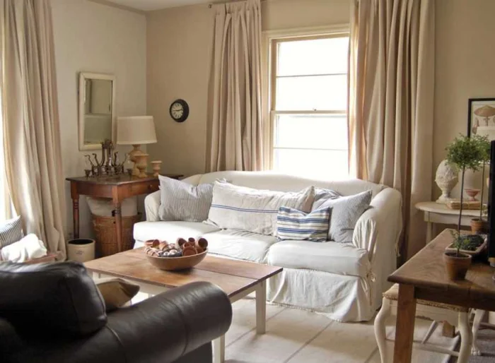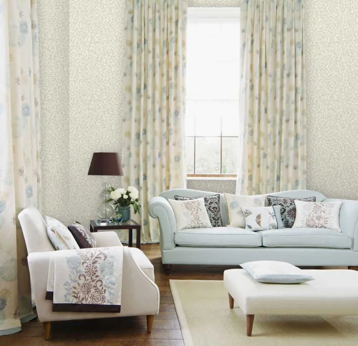 - Кантри. Деревенский уют. Легкие натуральные ткани (лён, хлопок) со скромным рисунком в светлой гамме.
