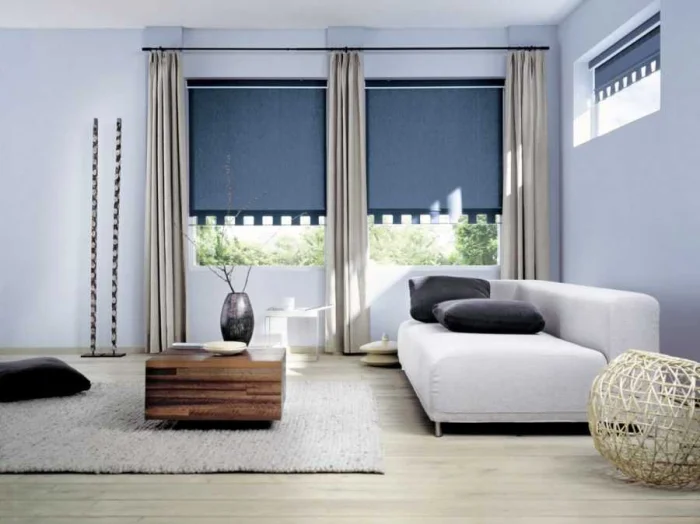 - Минимализм. Лаконичность — его суть. Ничего лишнего. Идеальны рулонные или японские шторы в серой, чёрно-белой гамме, без узоров.