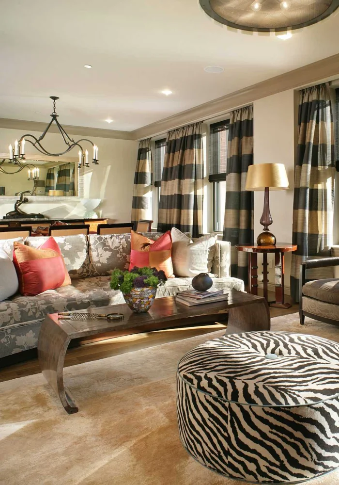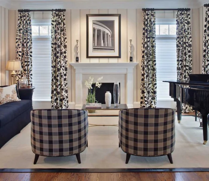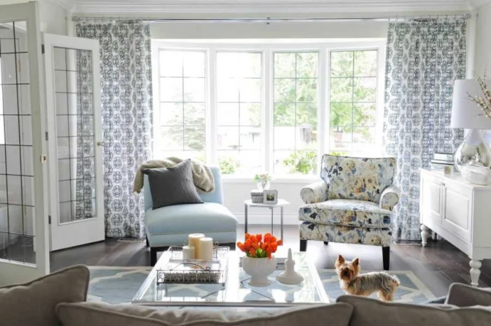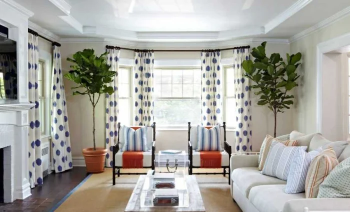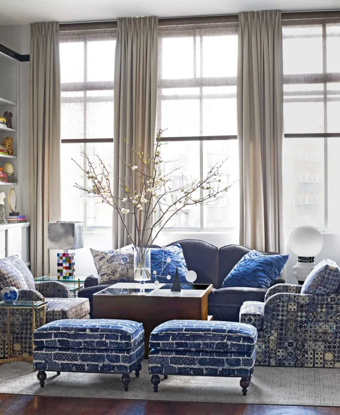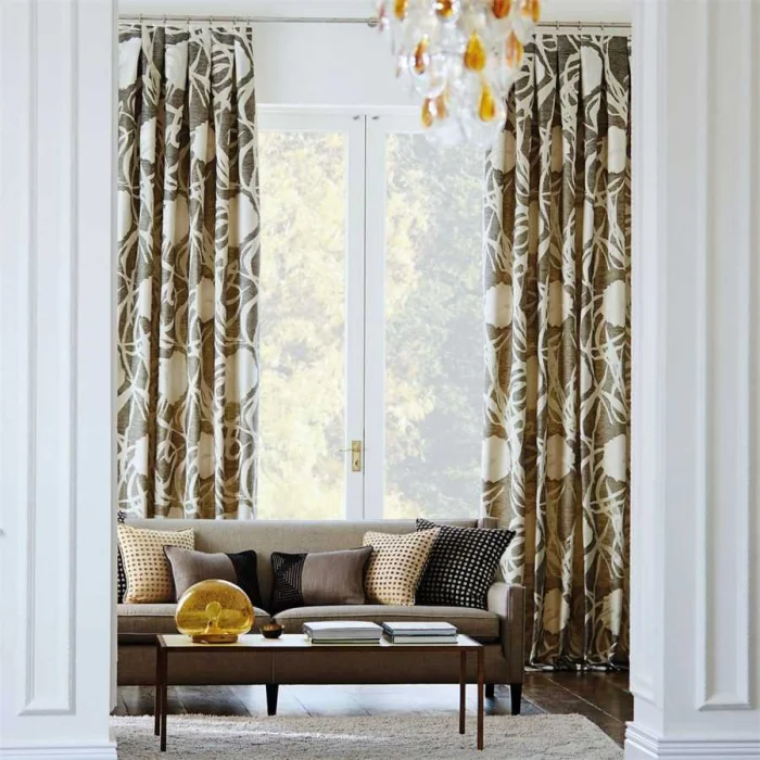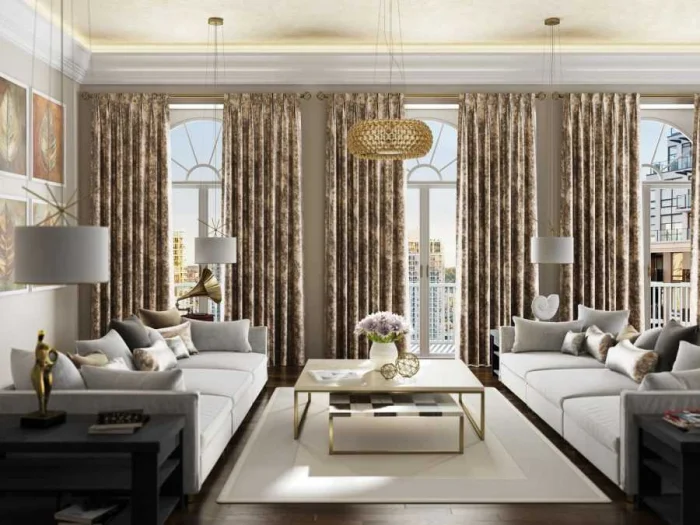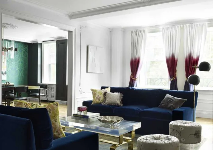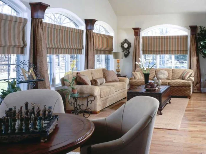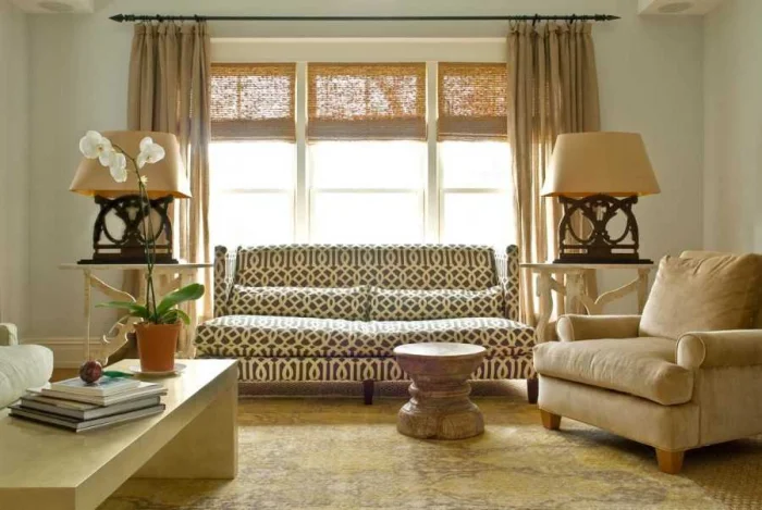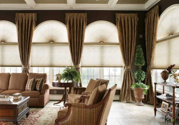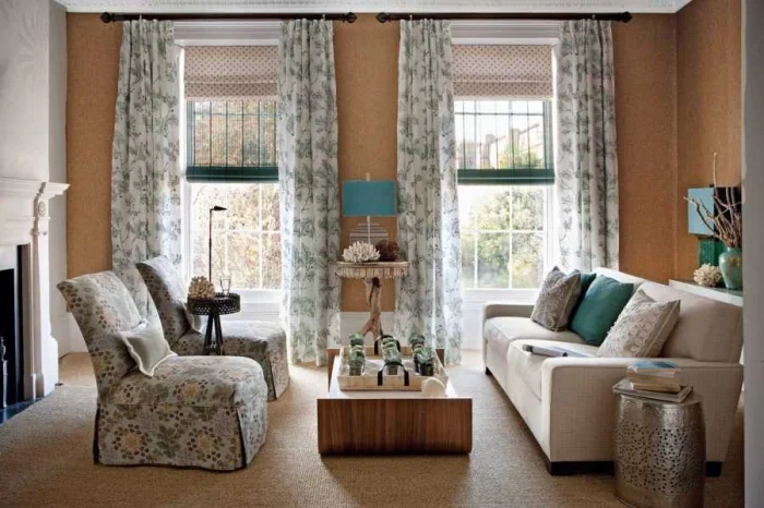 - Учитывайте реалии комнаты: освещение, размер, отделку. Тяжёлый бархат в маленькой тёмной гостиной — плохая идея.