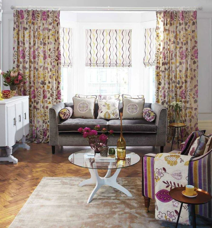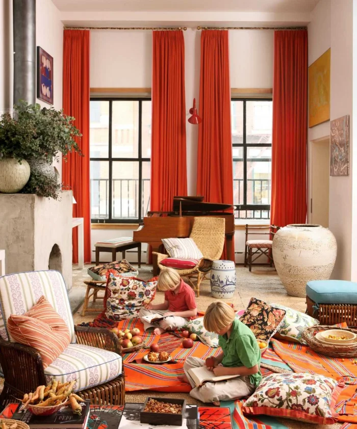 - Яркий, пёстрый интерьер. Спасайтесь однотонными шторами! Чтобы окно не «потерялось», используйте оттенки, близкие к основным цветам комнаты, или двухцветные модели.
