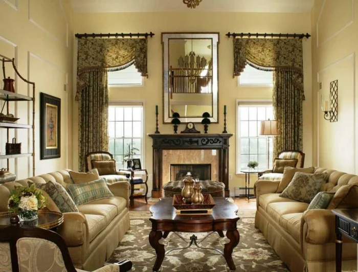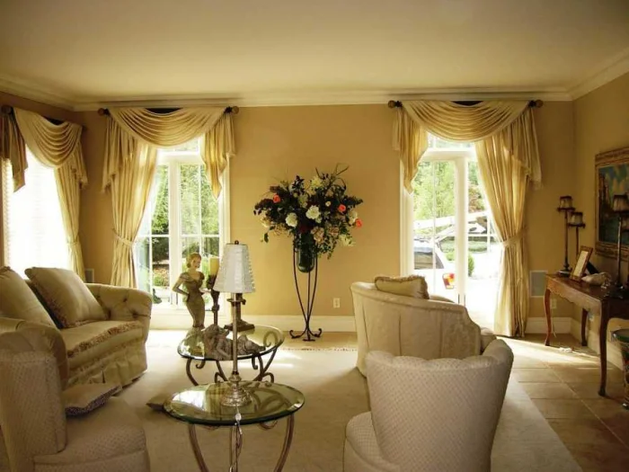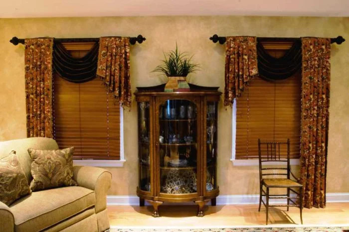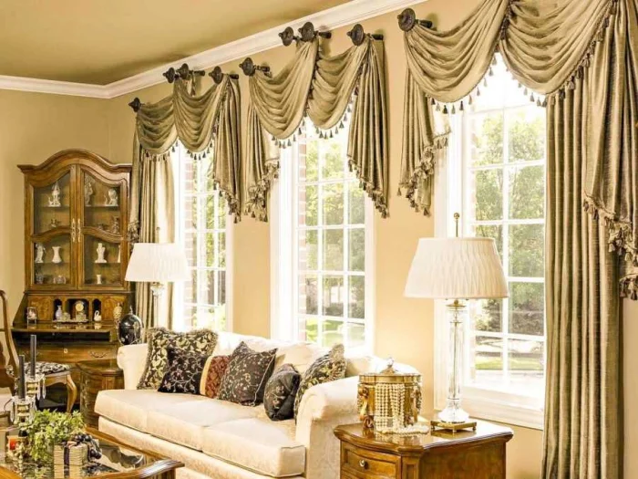 - Классика. Тяжёлые, благородные ткани: бархат, парча. Допустимы роскошные детали: ламбрекены, бахрома, вышивка. Фасоны: французские, австрийские, римские.