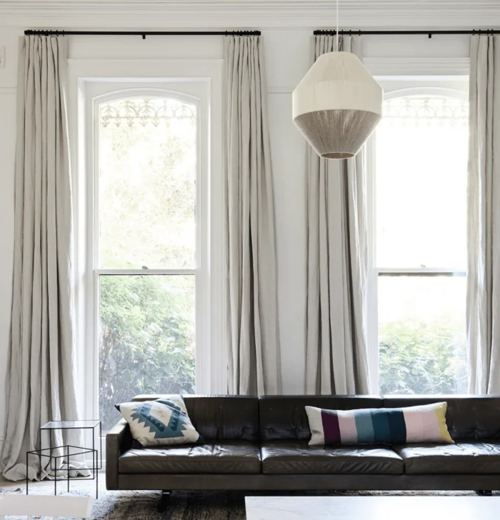 Практичное решение — рулонные или римские шторы. Если же хотите классические прямые, используйте магнитные подхваты: и стильно, и удобно — ткань не будет мешаться под ногами.
