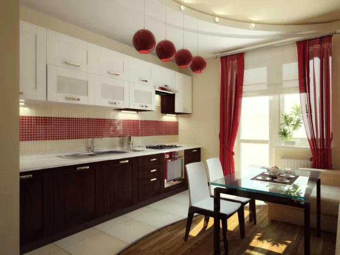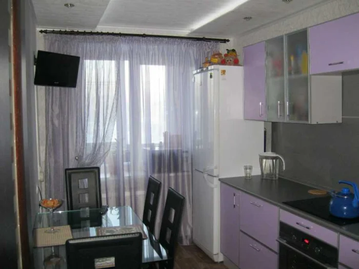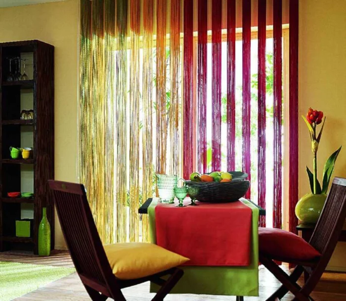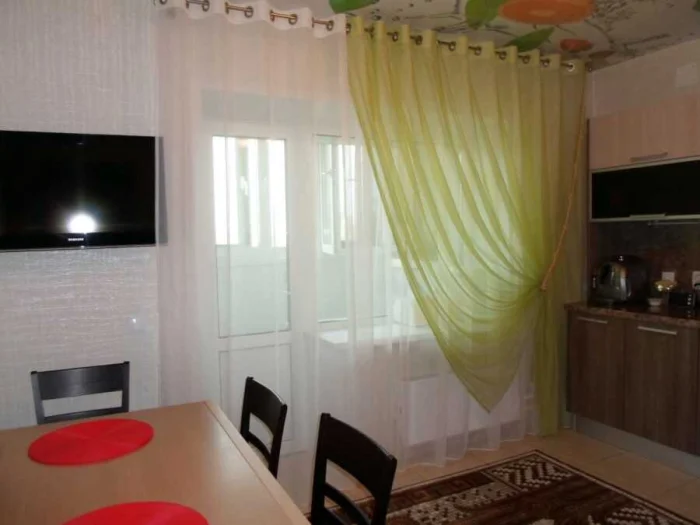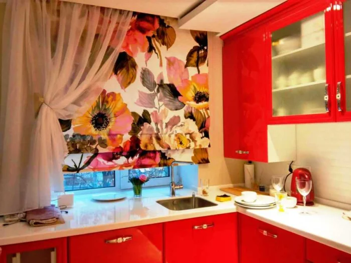 - Яркий акцент. Если вся кухня выдержана в одном цвете, смелые цветные шторы оживят её мгновенно.