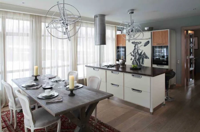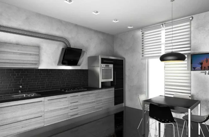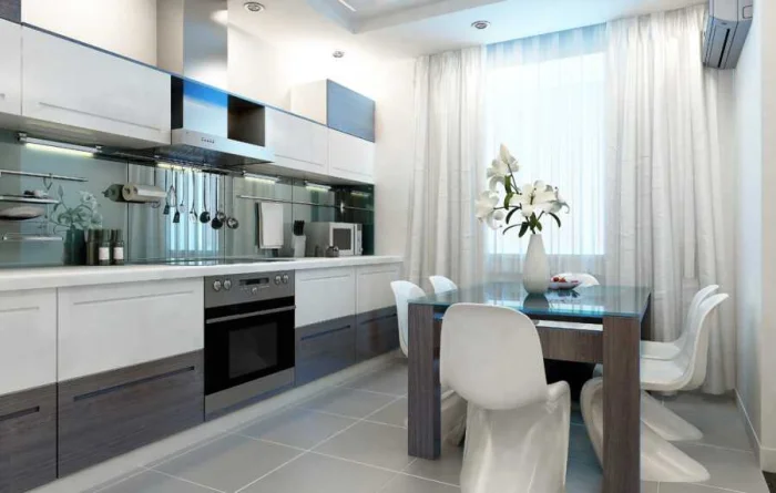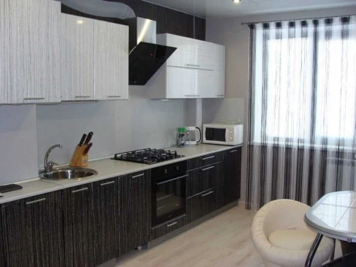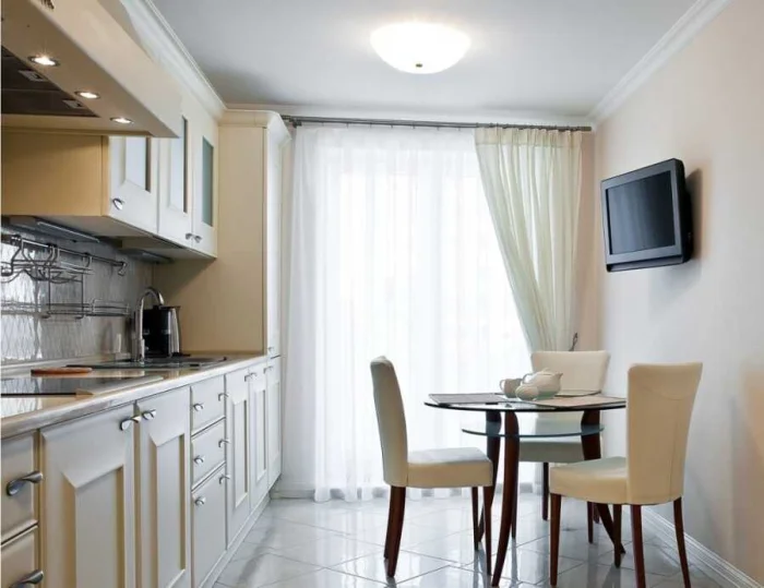 Модель занавесок должна следовать общему стилю кухни. В минималистичном пространстве пышная классика будет выглядеть чужеродно, и наоборот.
