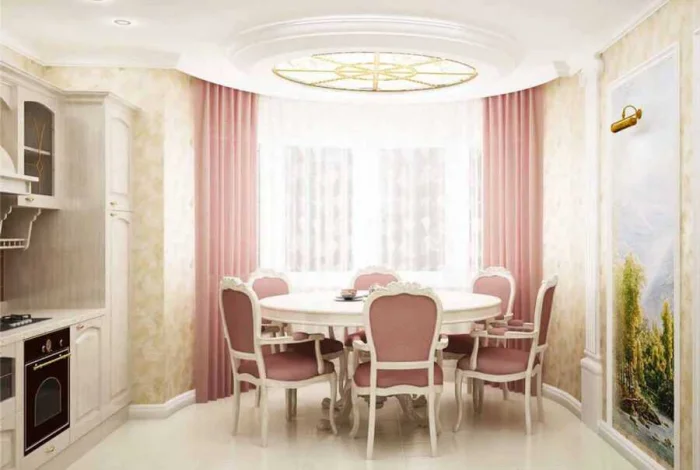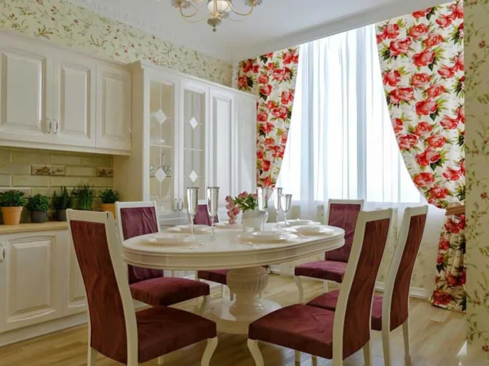 - Узор. Он должен перекликаться с другими принтами в комнате: на обоях, скатерти, обивке стульев.