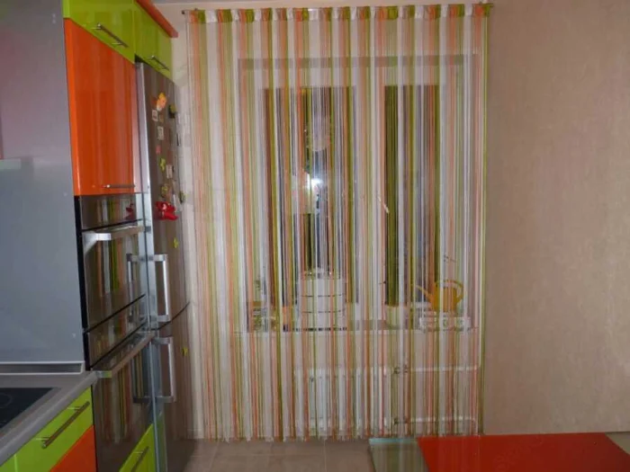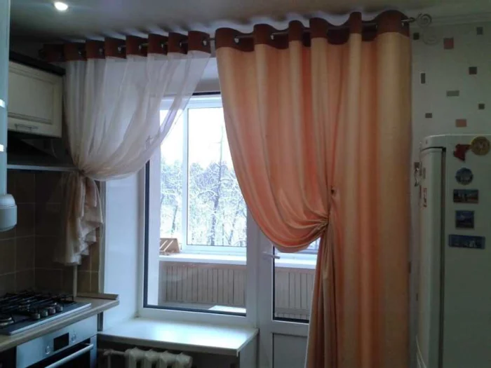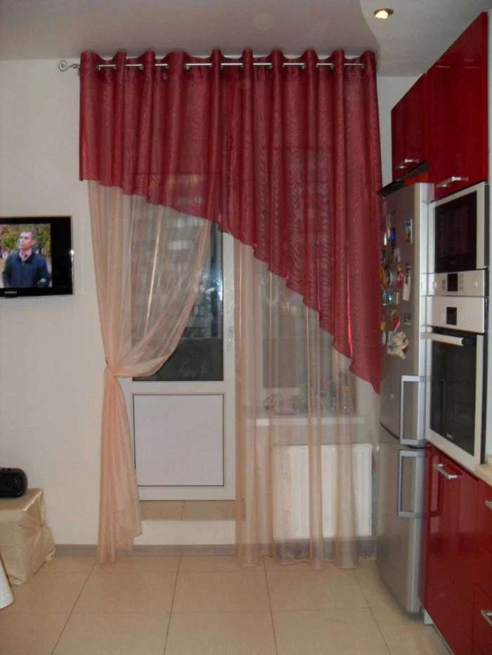- Длинные шторы хорошо маскируют балконную дверь, не мешая её открывать.