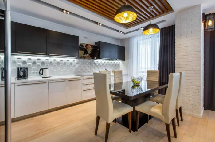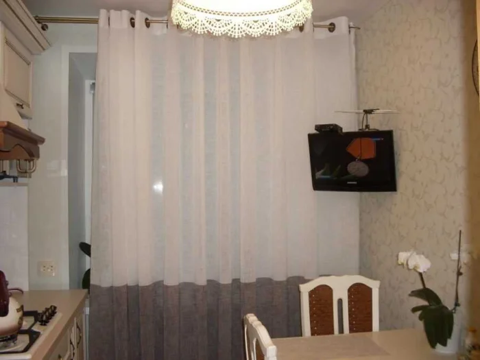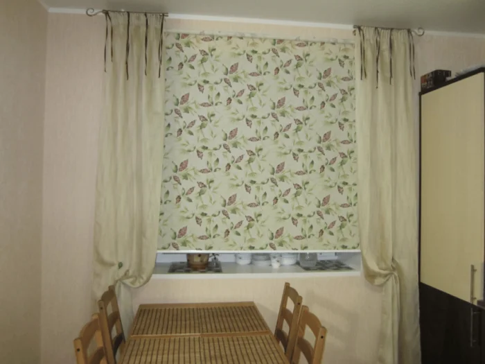- Минусы: В маленькой кухне длинные шторы «съедят» пространство. А ещё — десятки крючков, которые нужно снимать и вешать обратно. Готовы к этому каждую неделю?