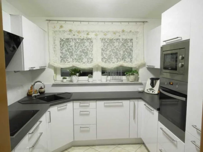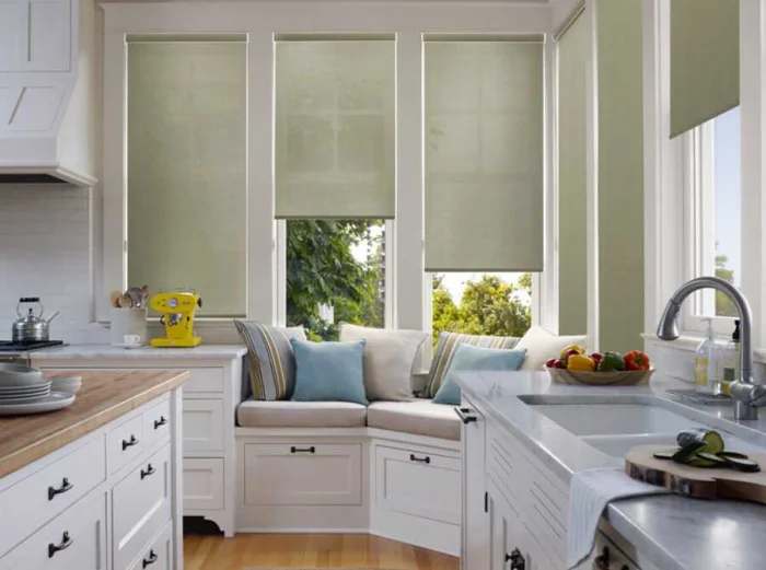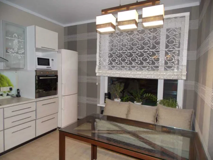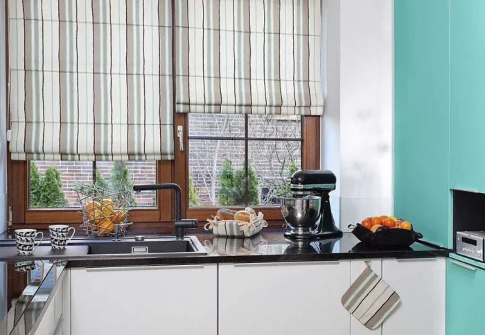 - Маленькая кухня? Забудьте о пышных портьерах. Ваши друзья — компактные модели: рулонные, римские шторы, жалюзи.