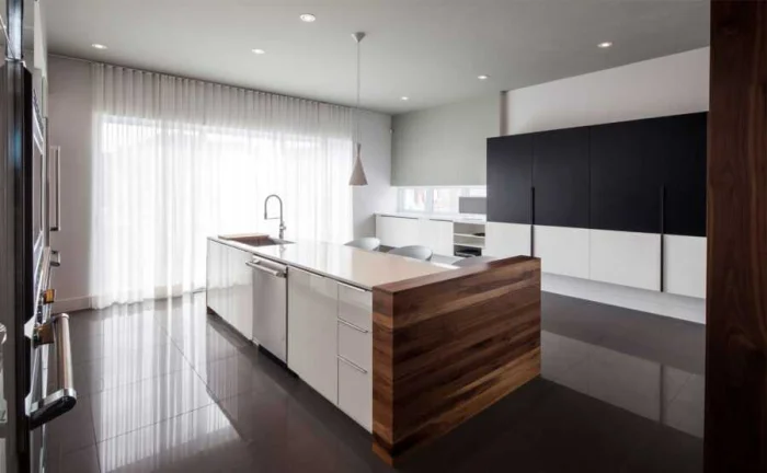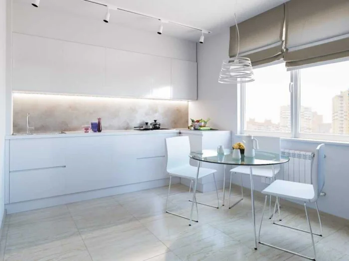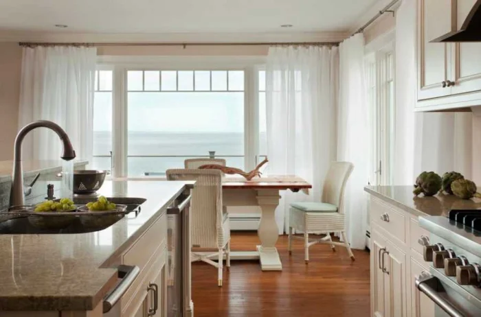 Для стиля минимализм идеальны лаконичные рулонные или римские шторы. А вот в просторной кухне-классике можно позволить себе и воздушный тюль, и плотные портьеры.