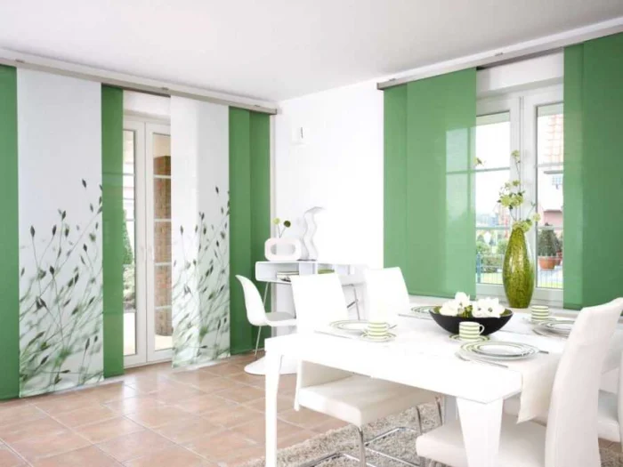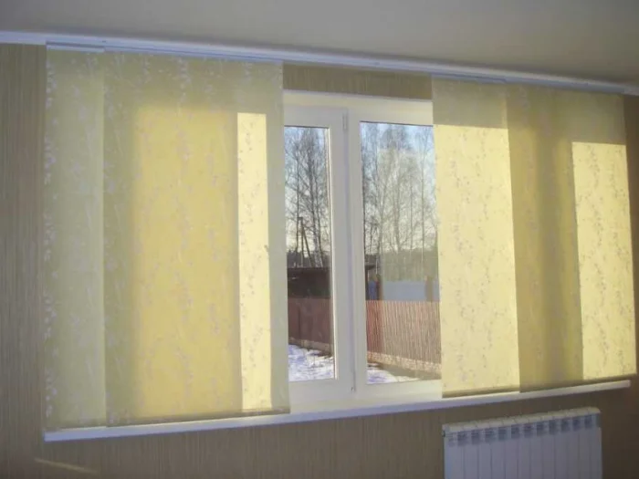 Это не просто ткань, а целая конструкция: текстильное полотно, натянутое на раму. Панели двигаются по направляющим, как двери-купе. Смотрится необычно, стильно, очень современно. Идеально для больших окон и интерьеров в духе минимализма или хай-тека. Минус один: в классическую кухню они не впишутся.