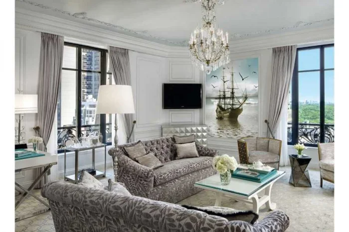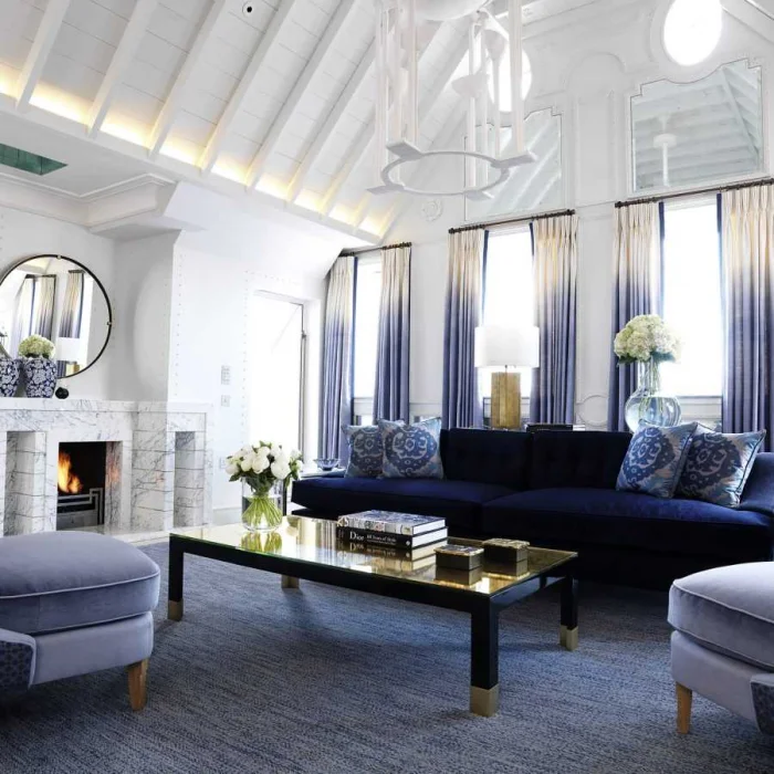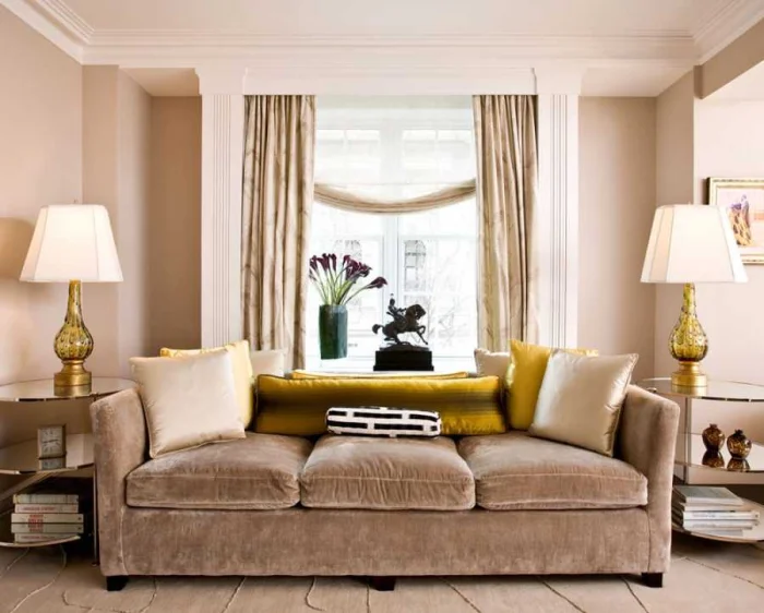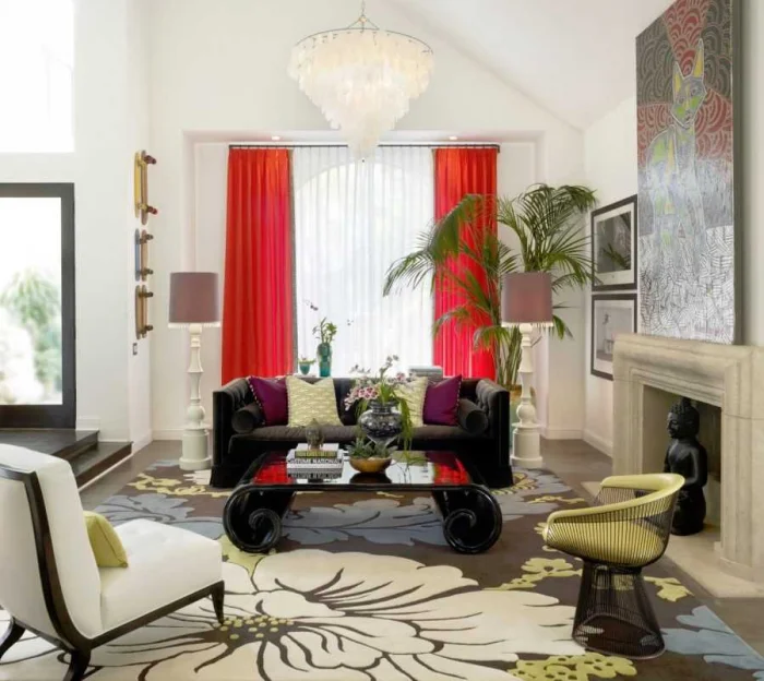 Тренд для гостиной — сдержанность. Чаще всего это однотонные полотна спокойных оттенков. Допустим некрупный геометрический или растительный рисунок. Для смелых — этнические орнаменты. Главное — чувство меры.