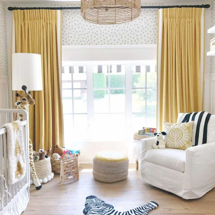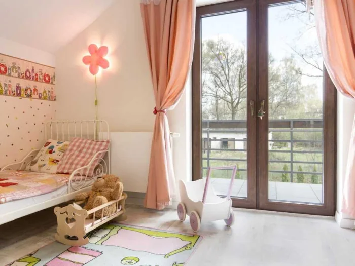 Тут всё подчинено двум принципам: безопасность и хорошее настроение. Ребёнок не должен запутаться в длинных полотнах или стянуть на себя тяжёлый карниз. Поэтому идеальны короткие модели или те же практичные рулонные/римские шторы.