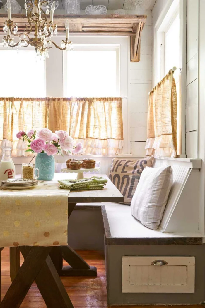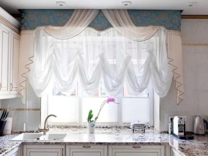 Для кухни идеальны практичные натуральные полотна: хлопок, лён. Если нужна серьёзная защита от солнца, выбирайте плотные ткани или… хитрый приём многослойности. Несколько лёгких полотен, наложенных друг на друга, создают потрясающую игру света и тени и отлично справляются с затемнением.