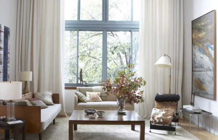 Классический набор «белый тюль + две портьеры» давно не догма. Длина может быть любой: от лаконичной, до подоконника, до смело-театральной, когда ткань живописно струится по полу.