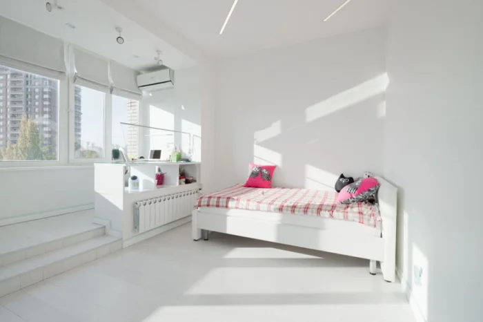 - Минимализм. Белый цвет, чёткие линии, ничего лишнего. Идеально для увеличения пространства.