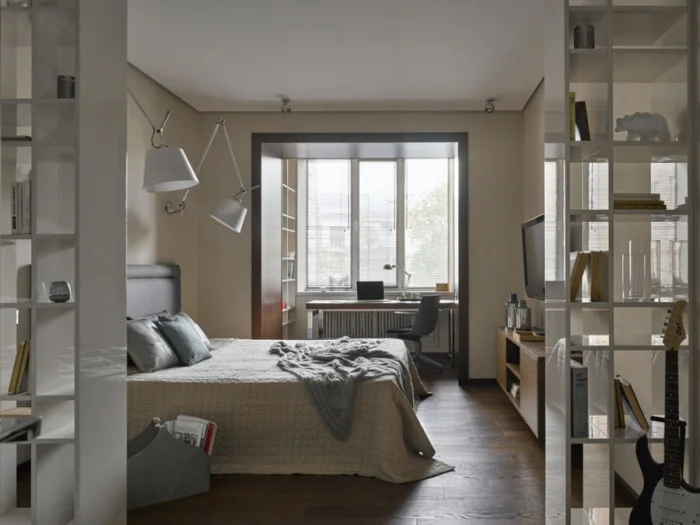 2. Зонирование. Помещения остаются разными функционально. Идеально, если вы хотите вынести на балкон зону отдыха с парой кресел или мини-кабинет. Можно поступить и наоборот: кровать поставить у окна на бывшем балконе, а в глубине комнаты устроить гостиную. Или вовсе оставить часть стены как барную стойку.