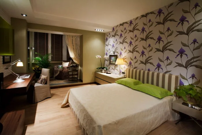 В просторной спальне балконную часть можно отдать под оранжерею. Зелень, вьюны, цветы — кусочек природы в каменных джунглях.
