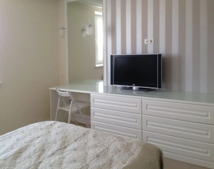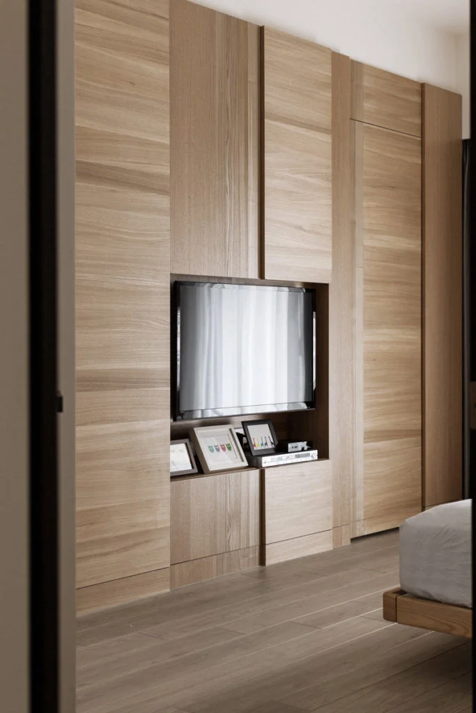 Самый удачный вариант — повесить телевизор так, чтобы его центр был чуть выше уровня ваших глаз, когда вы лежите. Голова при этом должна оставаться в естественном положении — без запрокидывания и без лишней подушки под шеей. Иногда телевизор встраивают в мебель, например, в стенку-купе со специальной нишей. Это тоже отличное решение.