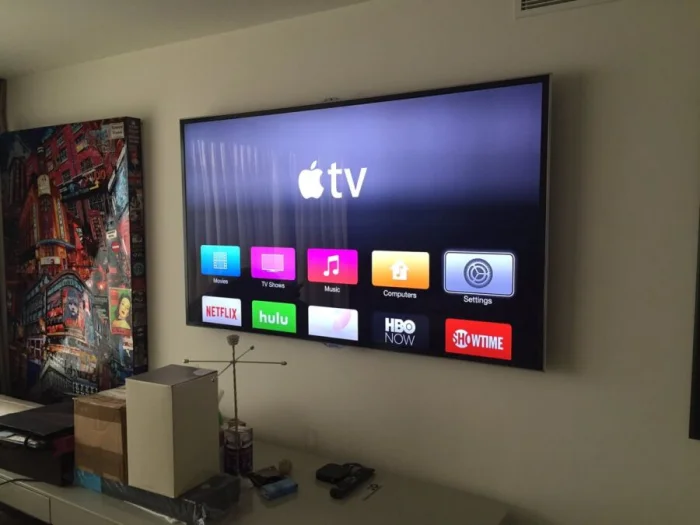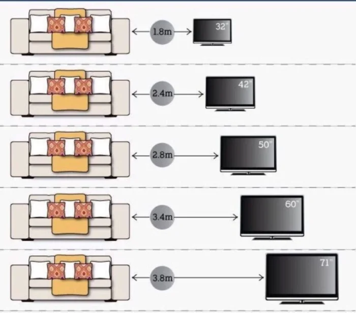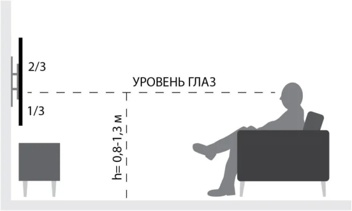 Специалисты вывели усредненные рекомендации: центр экрана должен находиться на высоте 1,4–1,6 м от пола в комнате со стандартными потолками. Если потолки высокие, можно поднять до 1,6–1,8 м.