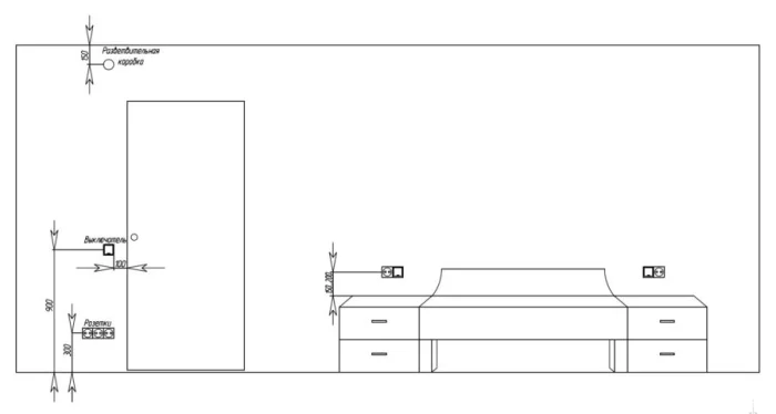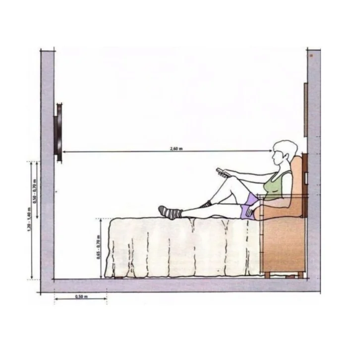 Для спальни, где смотрят лежа, оптимальная высота розетки — около 2 метров от пола. Ориентируйтесь на центр экрана: он должен быть на уровне глаз, а розетка — аккуратно скрываться за ним.