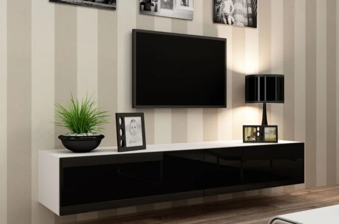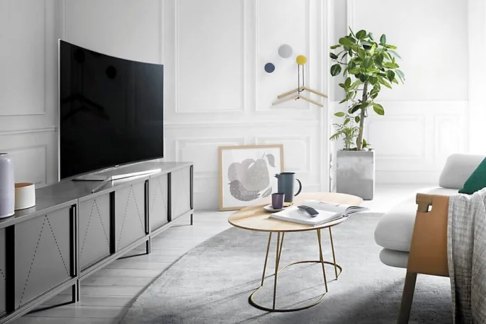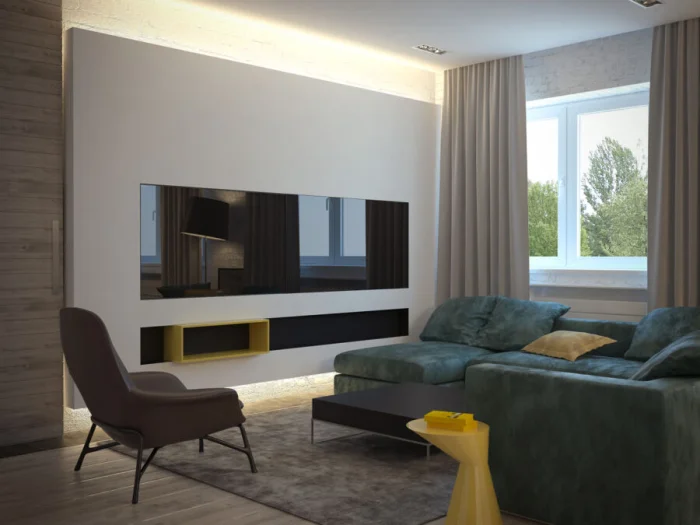 В большой комнате под медиатехнику можно выделить целую акцентную стену, сделав ее главным элементом дизайна.