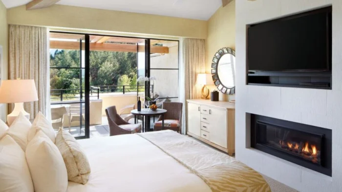 - Над камином. Открытый огонь и искры — явная угроза. Современные электрокамины безопаснее, но горячий воздух все равно поднимается вверх. Вешать технику ближе, чем в полуметре над очагом, я бы не рекомендовал.