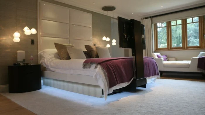 А представьте телевизор, подвешенный не напротив кровати, а прямо над ней? Смотрится футуристично! Но здесь критически важна надежность креплений и небольшой вес самой панели.