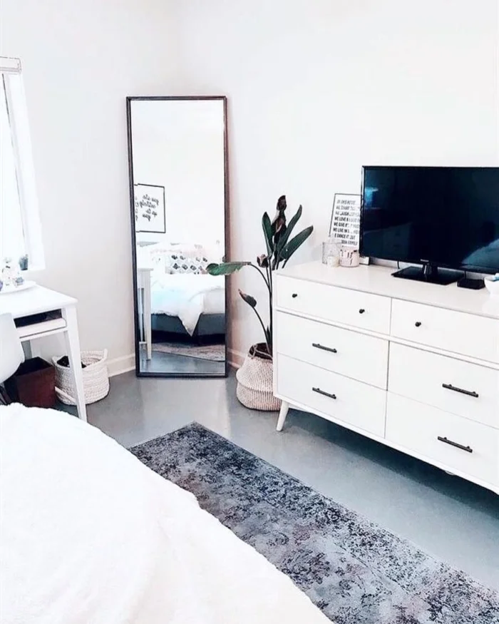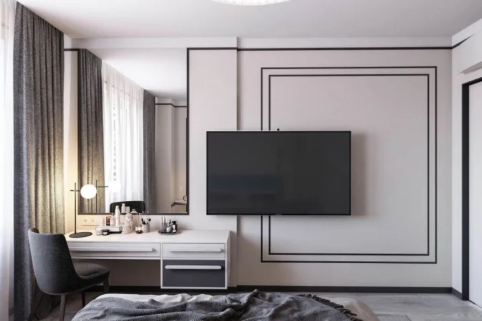 В маленькой или строгой спальне телевизор часто вешают на стену без лишнего декора. А иногда и вовсе оставляют на тумбе — это классика, которая не требует лишних проводов и сложного монтажа.