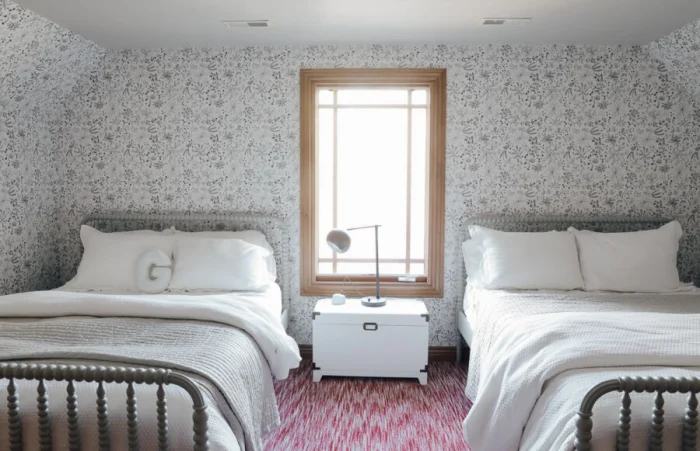 Ещё один хитрый приём — диагональный рисунок. Он «ломает» геометрию комнаты, отвлекая внимание от её скромных размеров. Комбинирование светлого фона с одним ярким акцентом тоже работает на ура.