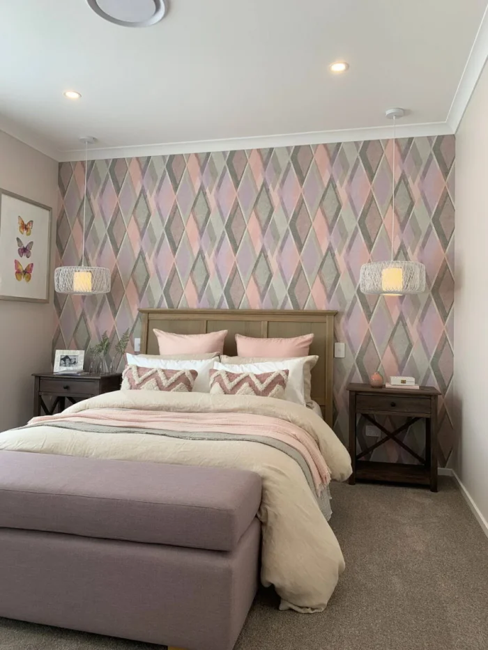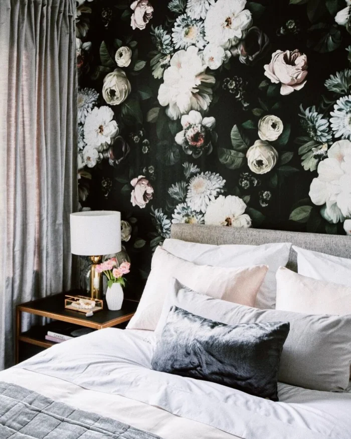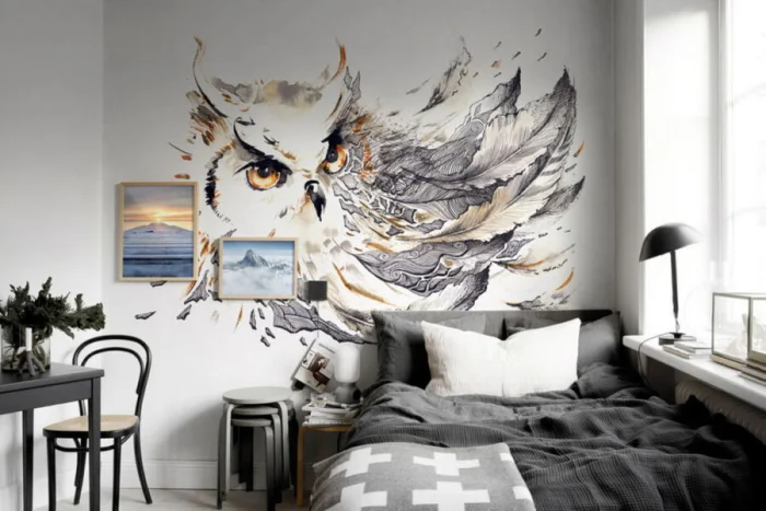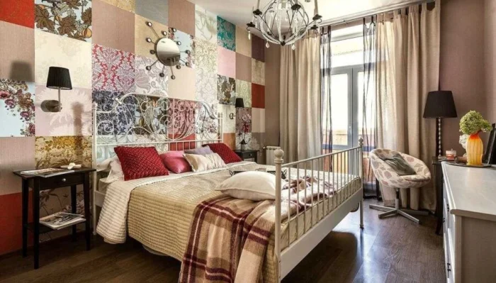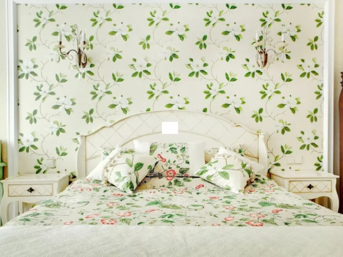 На смену классическим мелким изображениям цветов на стенах пришли объемные, крупные рисунки. Стильно смотрится в спальне клетка, нестандартная текстура или тематическое изображение на фотообоях.