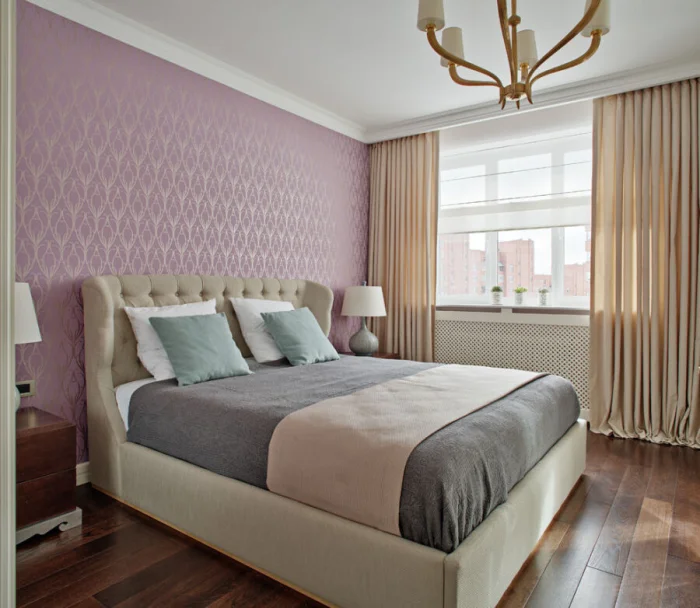 В спальни маленькой площади можно использовать фактурную текстуру с блеском. При освещении она также будет зрительно увеличивать пространство.