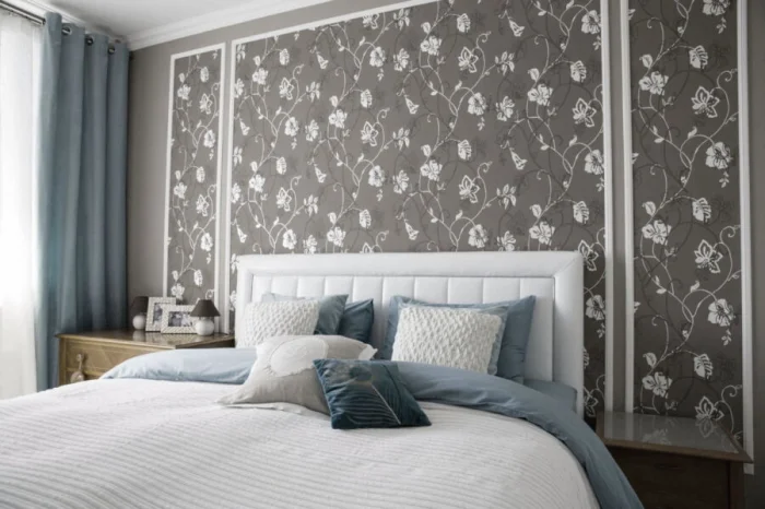 Комбинирование обоев — один из самых эффектных приёмов. Чаще всего он воплощается в идее «акцентной стены» — обычно той, что у изголовья кровати.