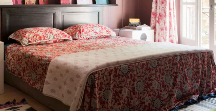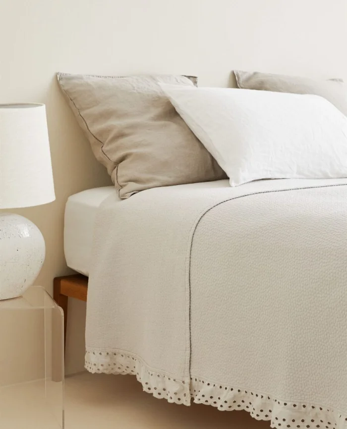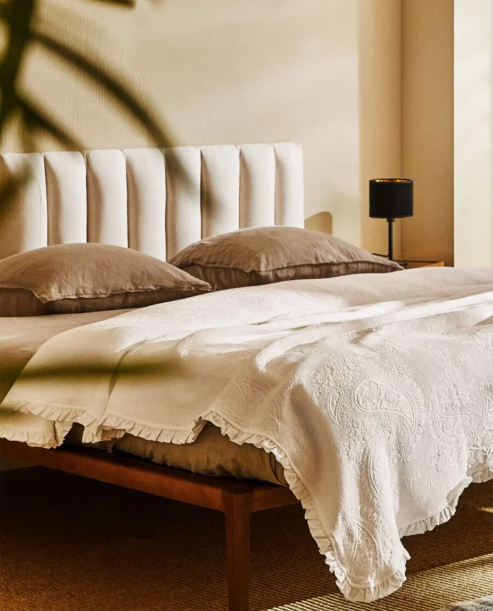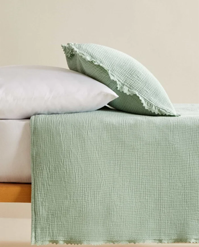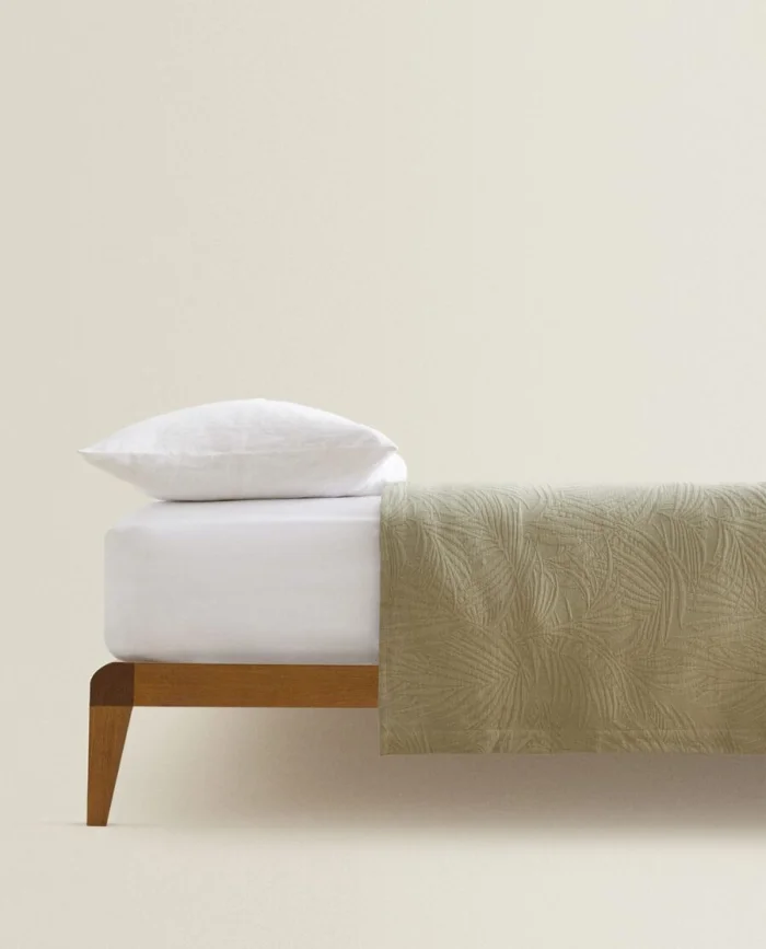Есть элегантный выход: использовать покрывало, которое заправляется под матрас, как простыня. В общем, для большой кровати лучше подходят плотные, хорошо драпирующиеся материалы, а для односпальной — более лёгкие и воздушные.