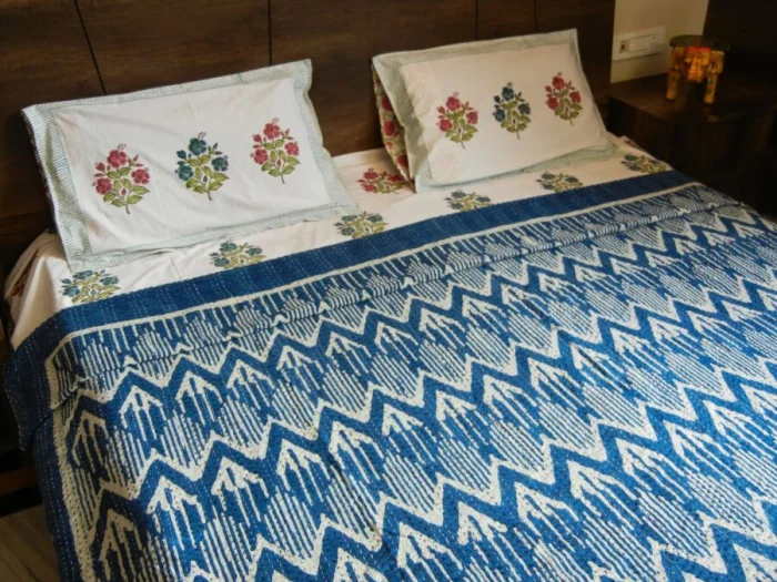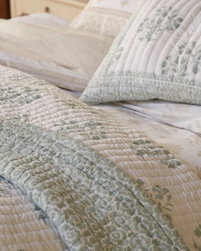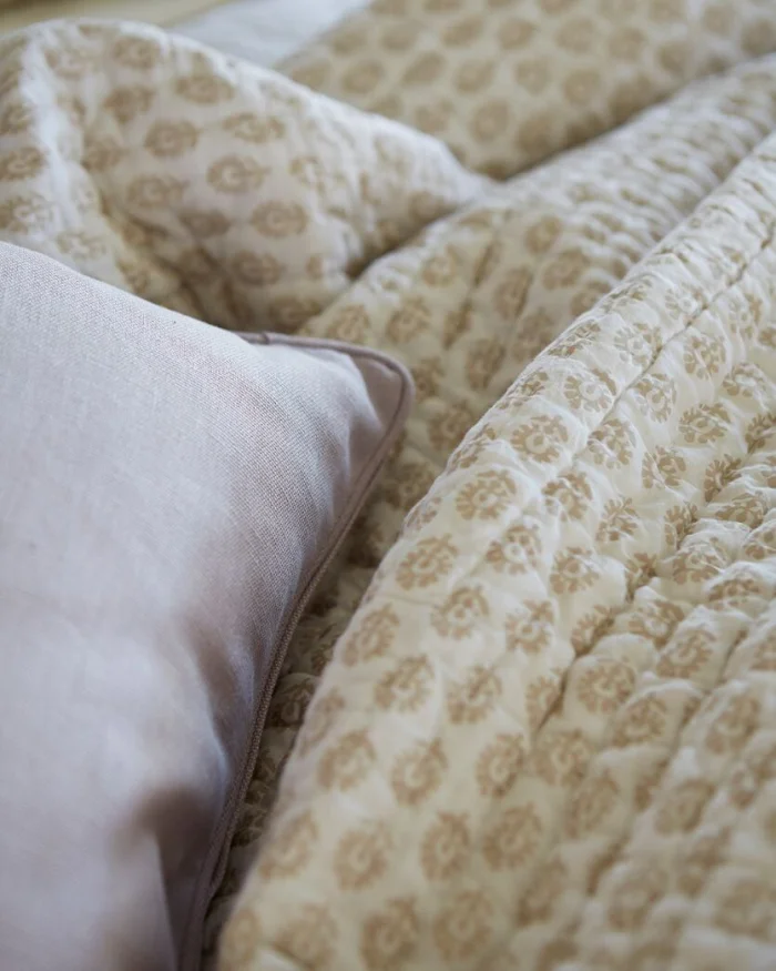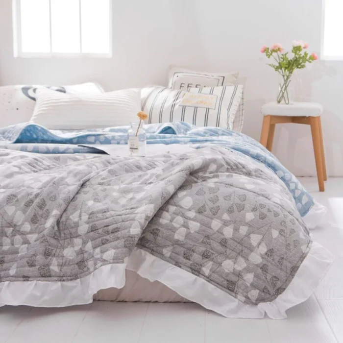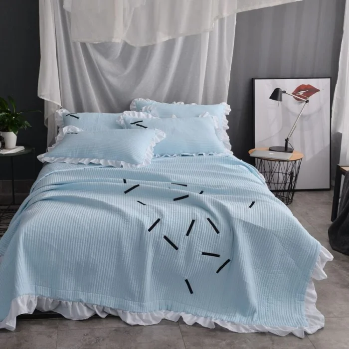 - Стёганое. Два слоя ткани с тонким утеплителем между ними. Может быть простым или с изящной каретной стяжкой. Кстати, такое покрывало — отличный проект для начинающей швеи. Ткани нужно немного больше, чем для обычного, а результат выглядит по-домашнему уютно.