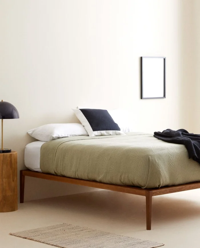 Лучшая стратегия — вписать покрывало в общую цветовую палитру комнаты. Особенно если спальня небольшая. Так кровать не будет кричащим пятном, выбивающимся из гармонии. Не обязательно добиваться точного совпадения со стенами. Достаточно взять цвет из той же гаммы, но на пару тонов светлее или темнее.