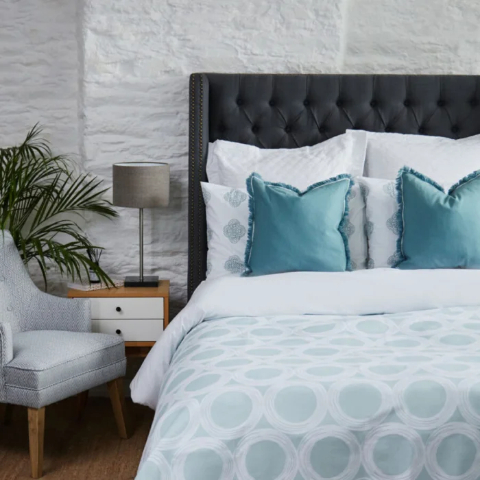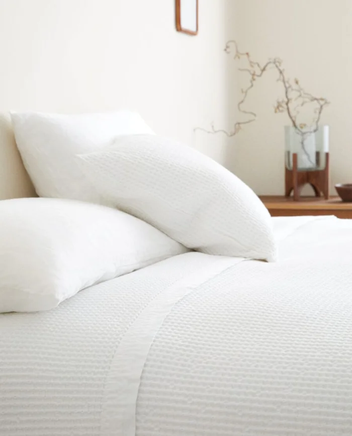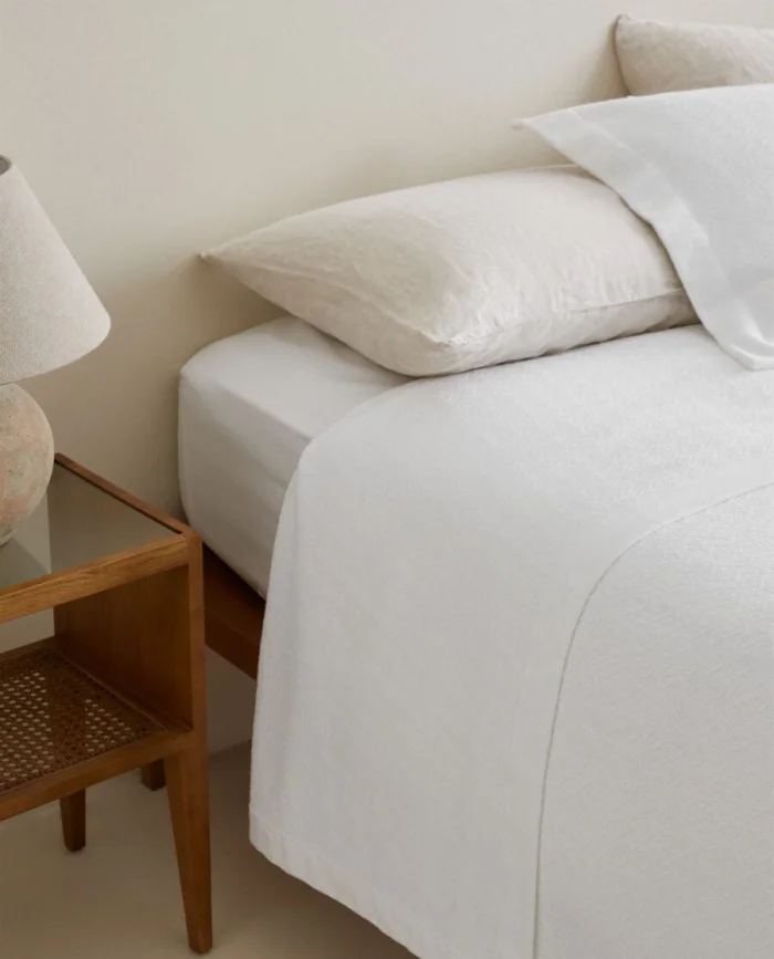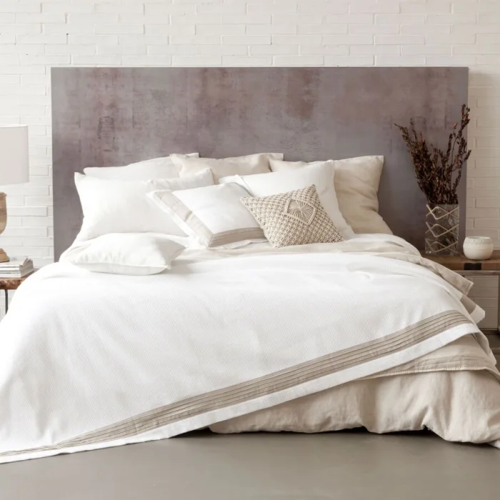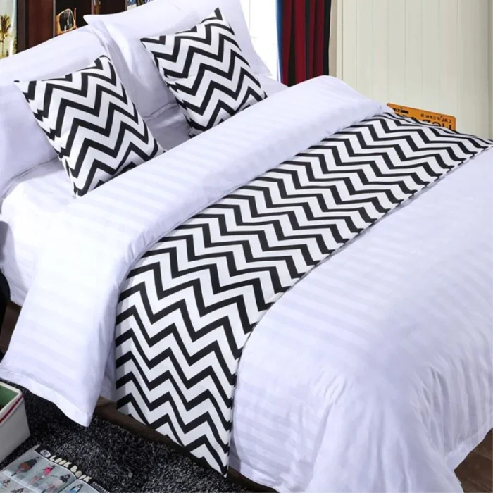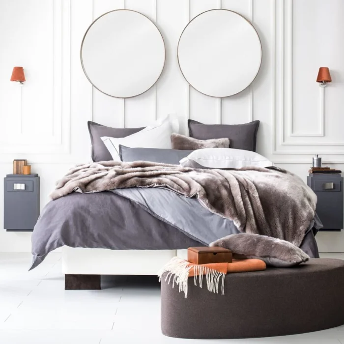 Яркий цвет или дерзкий узор — отличный способ расставить акцент в сдержанном интерьере. Широкая контрастная полоса по краю или декоративная подушка насыщенного цвета могут эффектно подчеркнуть белоснежное постельное бельё, не нарушая общей гармонии.