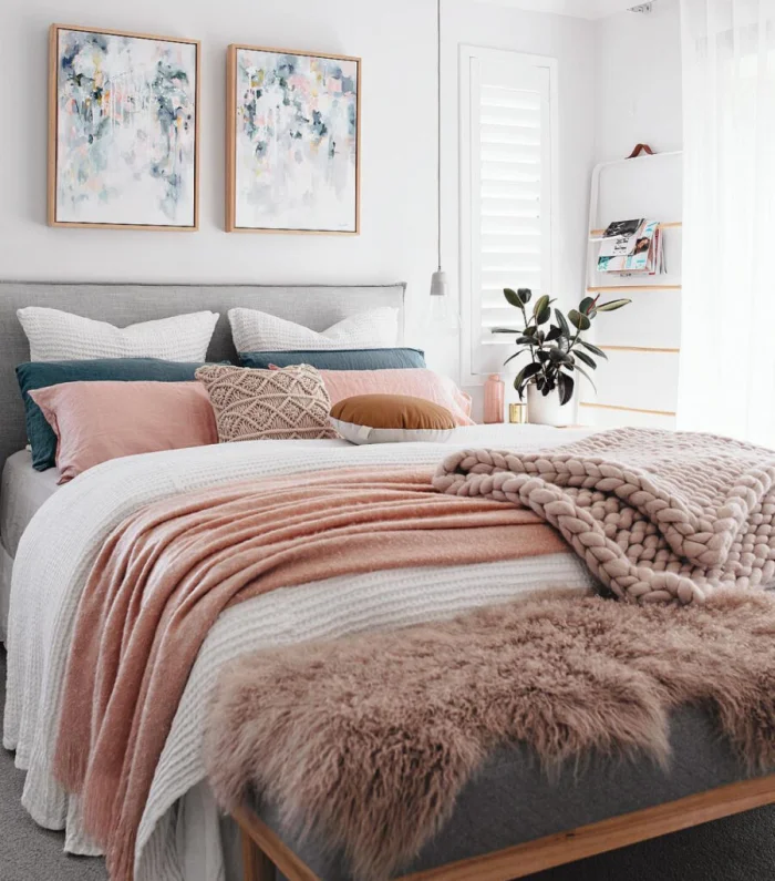 Плед с объёмной вязкой, меховая накидка или стёганое покрывало моментально делают комнату визуально теплее и уютнее. Летом их, конечно, можно заменить на что-то более лёгкое, например, на ажурный хлопковый вариант.
