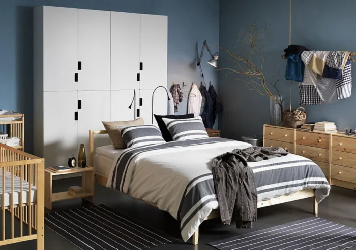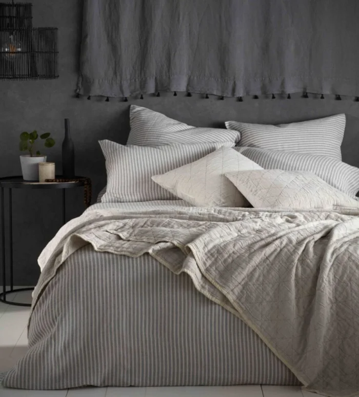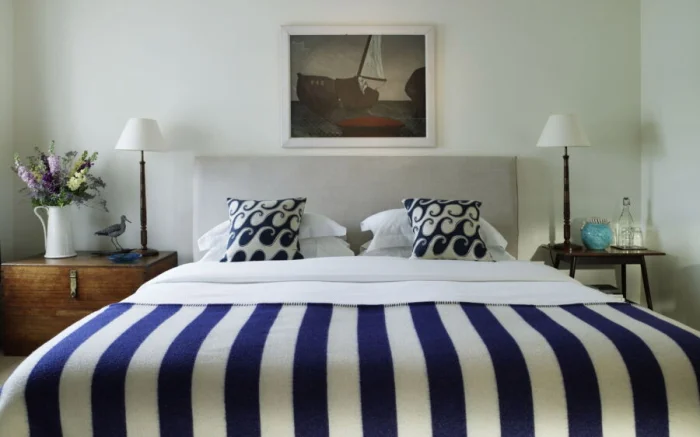 Полоска — вечная классика. Запомните простое правило: вертикальные линии зрительно поднимают потолок и направляют взгляд к изголовью, а горизонтальные — расширяют пространство. Полезный трюк, не правда ли?