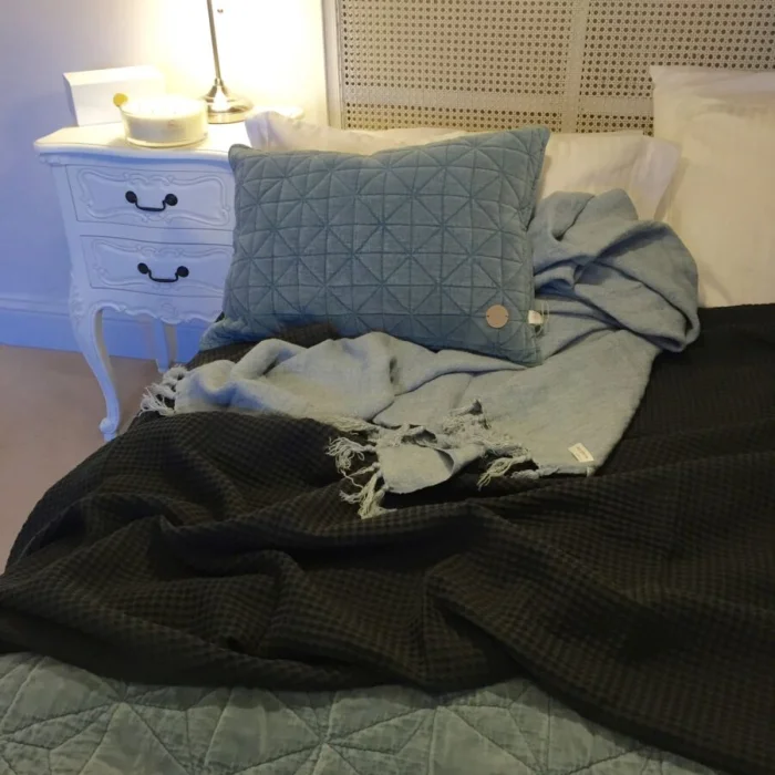 Такой приём создаёт эффект глубины и роскоши. Для повседневного использования вполне достаточно комбинации основного покрывала и одного пледа, небрежно наброшенного сверху.