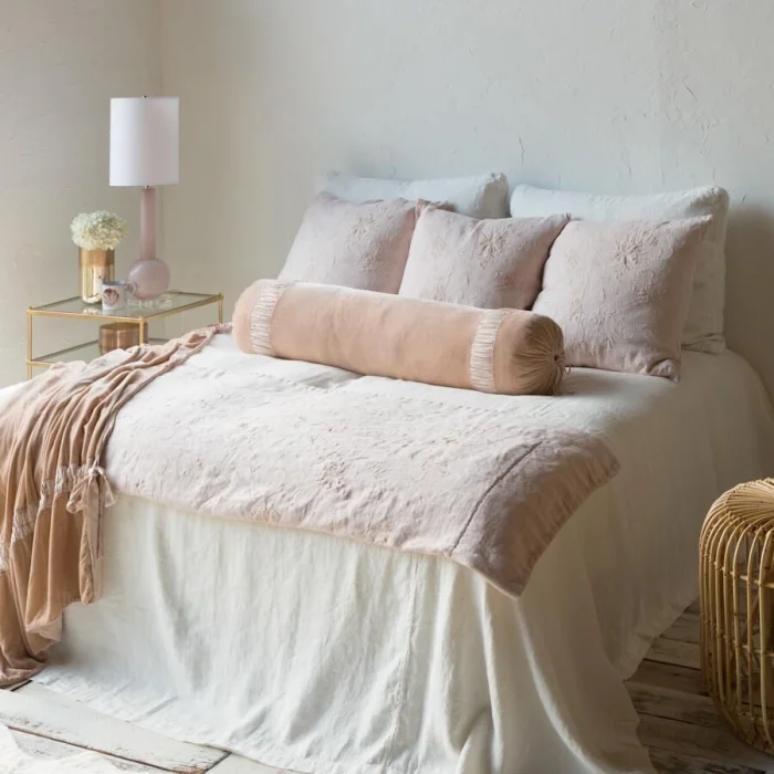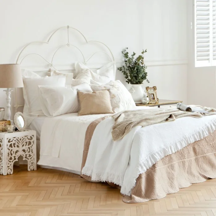 - Необычное. С вышивкой металлической нитью, стразами, аппликацией. Это уже не просто текстиль, а предмет искусства, который задаёт тон всей спальне.