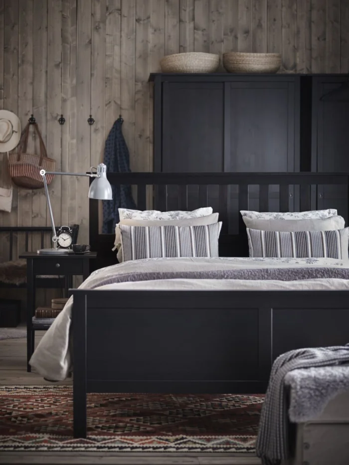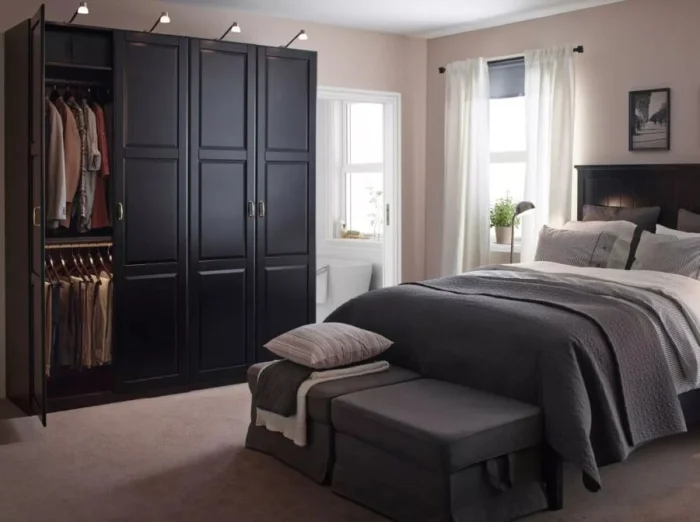 - Меньше — лучше. В спальне не нужен полный гарнитур из семи предметов. Ограничьтесь главным: кровать, система хранения, прикроватные тумбы.