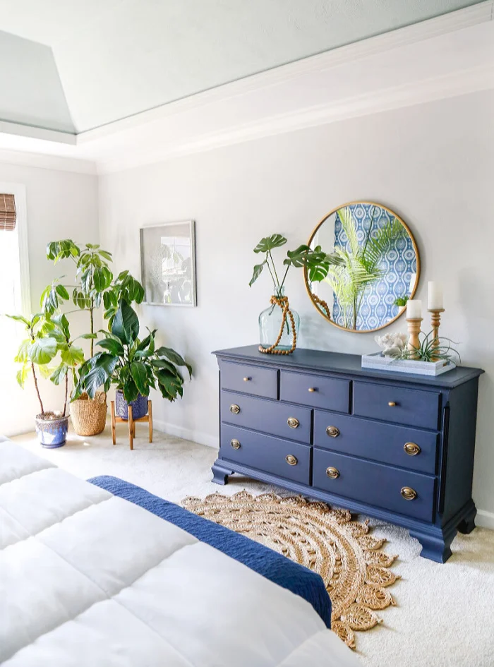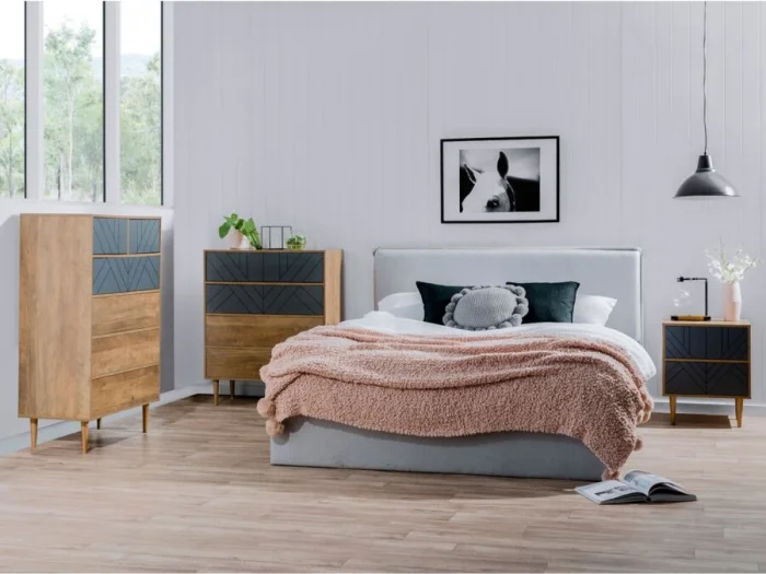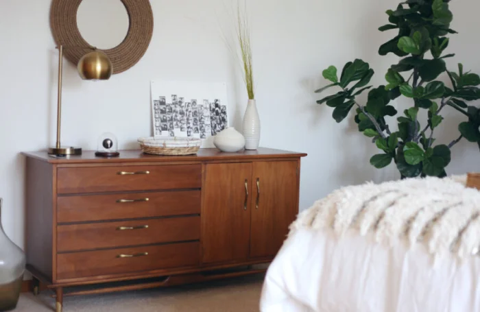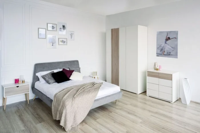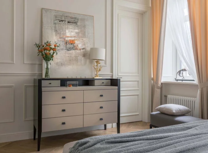 Комод — предмет не обязательный, но очень удобный. В нём можно хранить бельё, пижамы, аксессуары. Главное, чтобы он был в одной цветовой гамме с другой мебелью, создавая целостную картину.