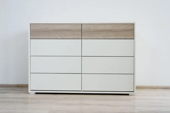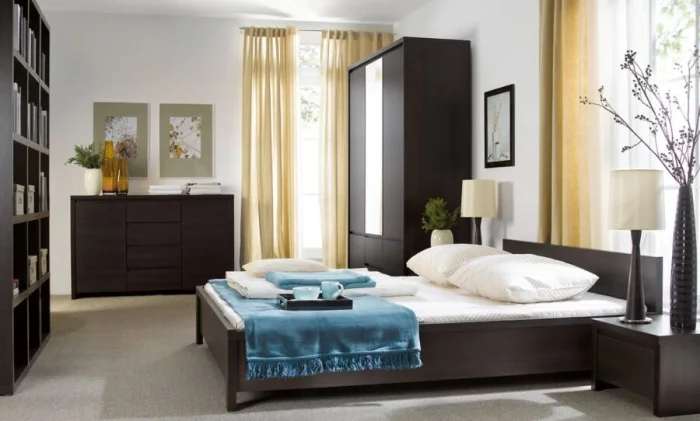 Очень часто размещают в спальне встроенный или модульный комод. Также можно разместить комод как из дерева, так и из пластика, в зависимости от общей стилистики спальни.