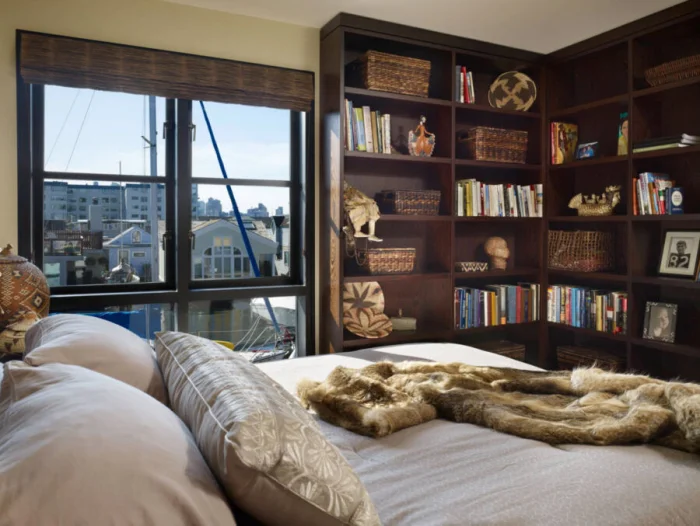Стеллаж — более воздушный и декоративный вариант. Он не скрадывает пространство и позволяет красиво расставить книги, декор. Главное — надёжно его закрепить. Идеальное место для него — готовая ниша.